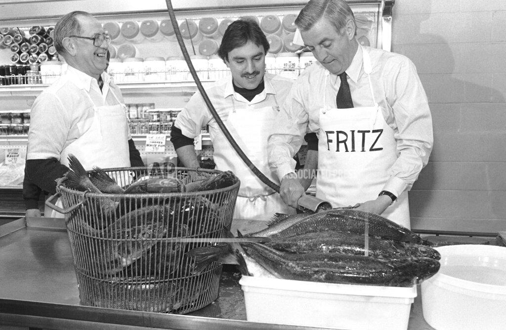 Amid the caviar and cocktail sauce, the whole dressed turtles and the frog’s legs, the candidate donned an apron labeled Fritz and expertly scaled a walleyed pike at a local fish market today. Then Walter F. Mondale cut into Gary Hart, resuming his strategy of attack after an evening of decorous debate with Mr. Hart and the Rev. Jesse Jackson. On a puddle-jumping tour through a rainy Pennsylvania and a sunny Wisconsin, the former Vice President painted Mr. Hart as insensitive to the plight of workers and slippery on the issues. “You need a President who reaches out and lightens the burden on the average American family,” he told a knot of pedestrians gathered in a neighborhood of wholesale food markets. Later, stopping in Madison and Milwaukee to woo support in the Wisconsin Democratic caucuses Saturday, Mr. Mondale promoted himself as the leading proponent of a freeze on nuclear weapons, saying Mr. Hart had come late to that view. Wisconsin was the first state to pass a referendum supporting a mutual, verifiable freeze, and the issue is an emotional one there.