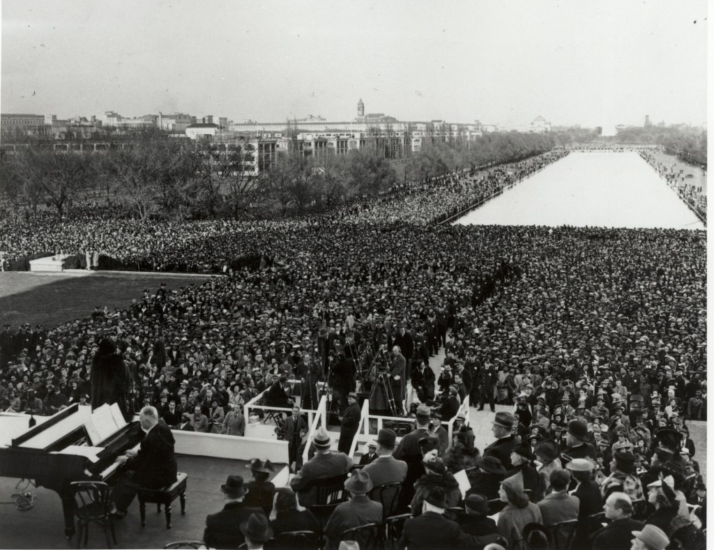 On Easter Sunday Marion Anderson, at the invitation of Secretary of the Interior Harold L. Ickes, sang a triumphant outdoor concert at the Lincoln Memorial before a crowd of 75,000 and a radio audience of millions. Anderson stood on the steps of the Lincoln Memorial in Washington DC and sang “My Country, ‘Tis of Thee”. A crowd of 75,000 listened to her on the Mall, and millions more tuned in on the radio. She sang where she did because she had been refused the use of Constitution Hall by its owners. Marian was black, and the owners had a white-artists-only clause. In early 1939, the Daughters of the American Revolution denied the internationally famed Black contralto the opportunity to sing at Constitution Hall in Washington, D.C., because of her race. First Lady Eleanor Roosevelt was so dismayed by the injustice that she resigned her own D.A.R. membership in protest.