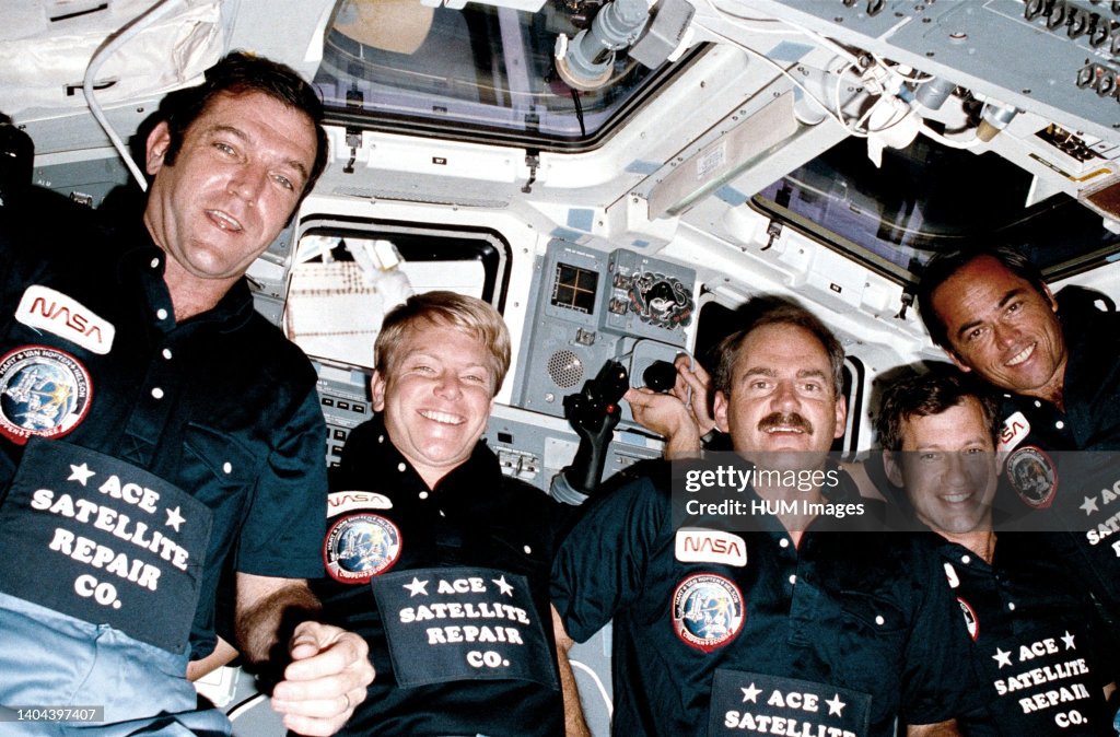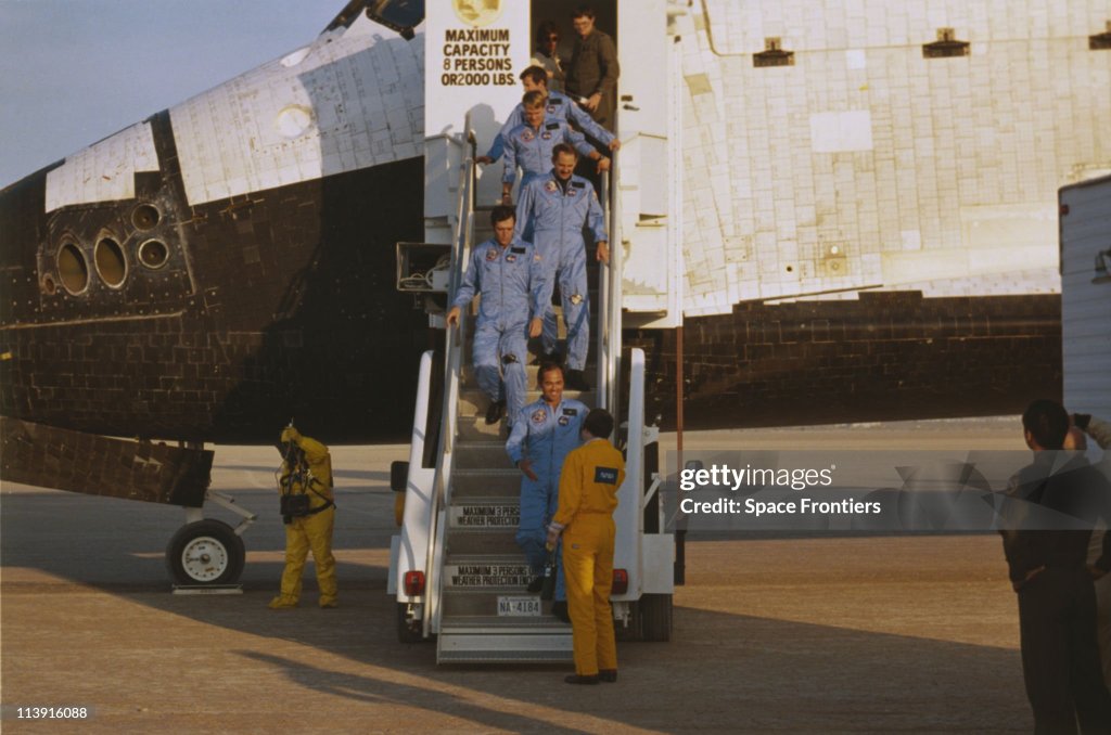 The commander of the mission, Capt. Robert L. Crippen of the Navy, guided the shuttle to a perfect landing in the Mojave Desert at 5:38 AM, Pacific time, as the rising sun washed the seven-mile runway in hues of pink and orange. Flying with Captain Crippen were Francis R. Scobee, the pilot, Dr. George D. Nelson, Dr. James D. van Hoften and Terry J. Hart. The 98-ton Challenger kicked up dust clouds in the cool morning air before it rolled to a stop before a handful of spectators. On greeting the astronauts, Guy Gardner in Mission Control quipped, “Welcome back on Friday the 41-Charlie.” It was a standing joke. The mission had been formally designated STS- 13 shuttle flight, but the astronauts had changed their every mention of 13 to “41-C” or “41-Charlie,” using arcane code numbers that more specifically described the mission.
