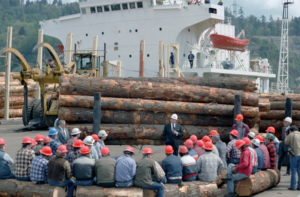 President Reagan addresses a group of dock-workers in Tacoma, Washington.