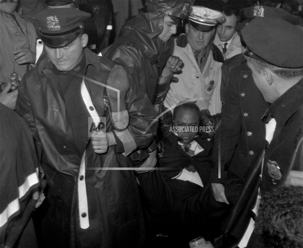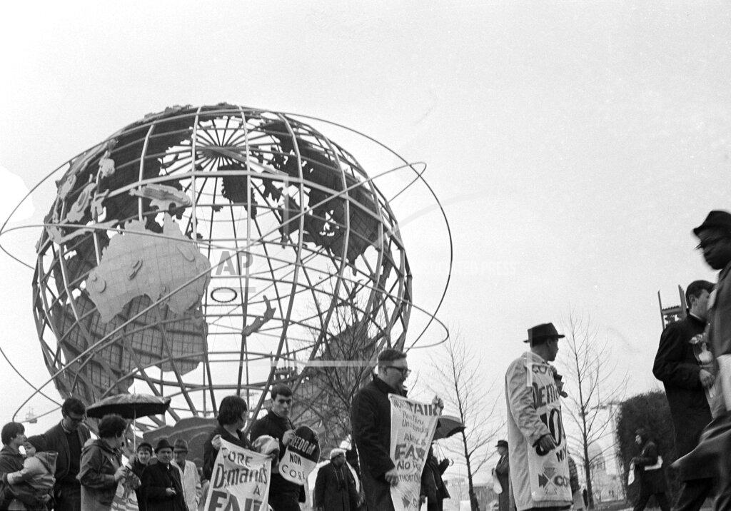 Among those arrested were leaders of the demonstration. James Farmer, national director of the Congress of Racial Equality, and Bayard Rustin, organizer of last summer’s March on Washington, were taken into custody as the police dispersed a sit‐in at the New York State Pavilion. The militant integrationists were unable to disrupt the opening ceremonies, of which the climax was the President’s speech to 10,000 rain‐soaked spectators in Singer Bowl. Entrance to the bowl was by invitation only.