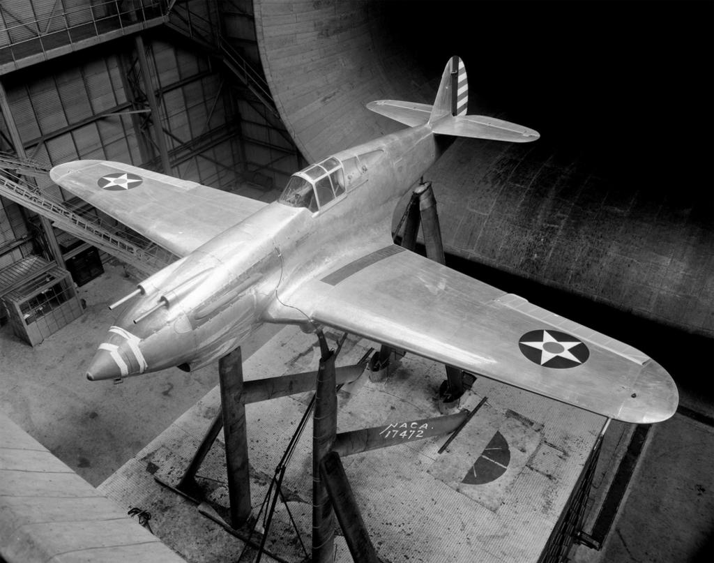 Curtiss-Wright’s prototype fighter, the XP-40 (Model 75P), was evaluated by the National Advisory Committee for Aeronautics (NACA) at the Langley Memorial Aeronautical Laboratory, Langley Field, Virginia, in March and April 1939. NACA engineers placed the XP-40 inside the Full-Scale Wind Tunnel, which was capable of accepting airplanes with wing spans of up to 40 feet (12.2 meters). The airplane was a production Curtiss P-36A Hawk, serial number 38-10, which had been modified by replacing its original air-cooled Pratt & Whitney Twin Wasp S1C1-G (R-1830-17) 14-cylinder radial engine with a Harold Caminez-designed, liquid-cooled, supercharged, 1,710.597-cubic-inch-displacement (28.032 liter) Allison Engineering Co. V-1710-C13 (V-1710-19).