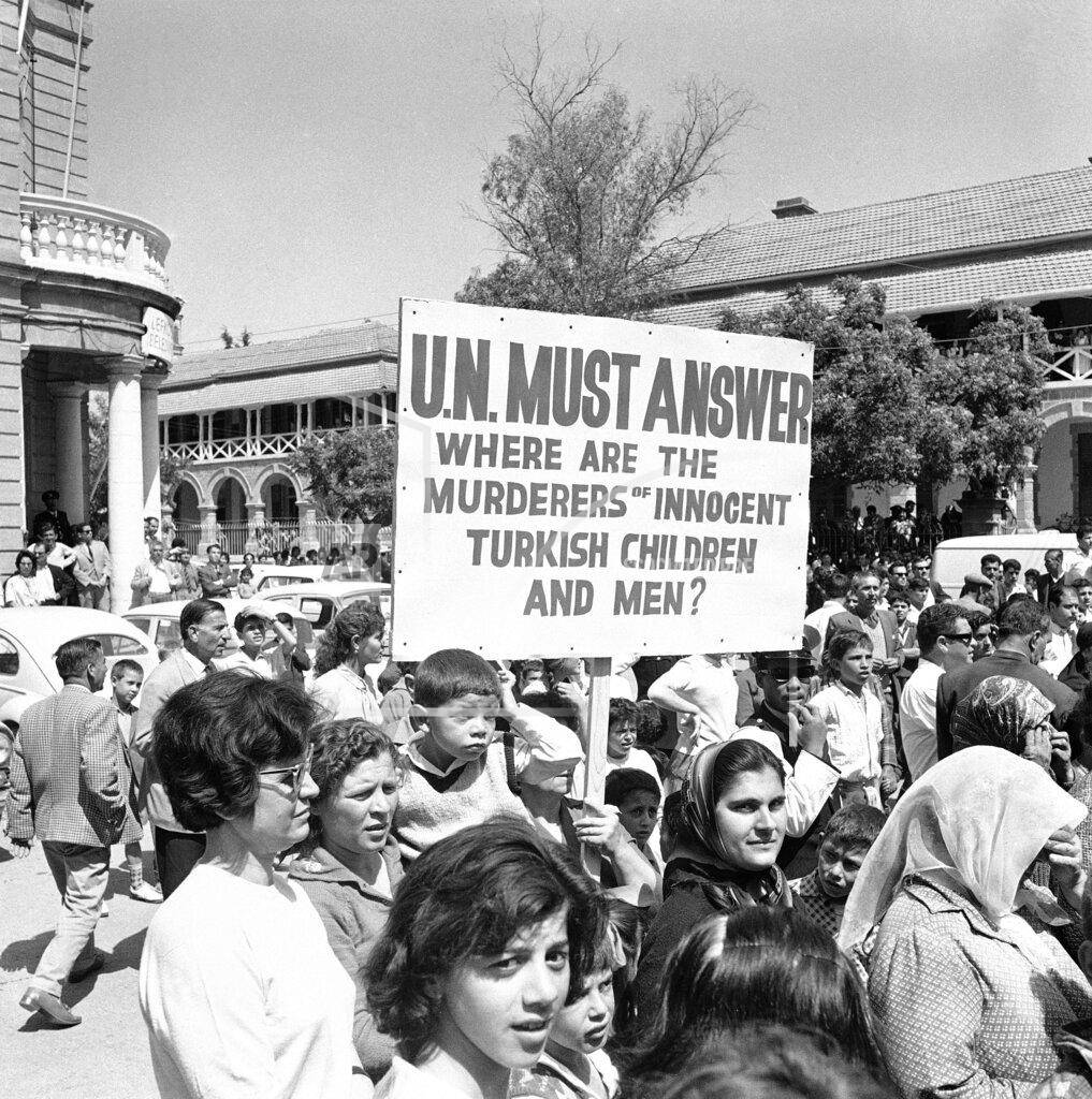 This evening, when the general again went to see Dr. Kutchuk, he was provided with a Turkish Cypriote police escort. This morning’s demonstration started at Ataturk Square in the Turkish quarter. The women, some of them pushing baby. carriages, carried banners and placards denouncing the general and the United Nations. One sign read, “The United Nations is a disgrace.” Another said, “Gyani, tool of Makarios, go home to India.” Archbishop Makarios, President of Cyprus, is the leader of the Greek community. A Turkish Cypriote committee of women refugees gave Dr. Kutchuk a protest message to be relayed to U Thant, Secretary General of the United Nations, Premier İsmet İnönü of Turkey and General Gyani. The Turkish Cypriotes have had doubts about General Gyani’s impartiality from the beginning, particularly because India, his nation, has been opposed to partition, which they favor. Now they are calling him “Gyanides” to indicate their belief that the general favors the Greek Cypriotes, who outnumber them four to one.