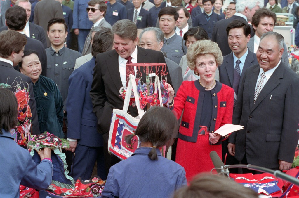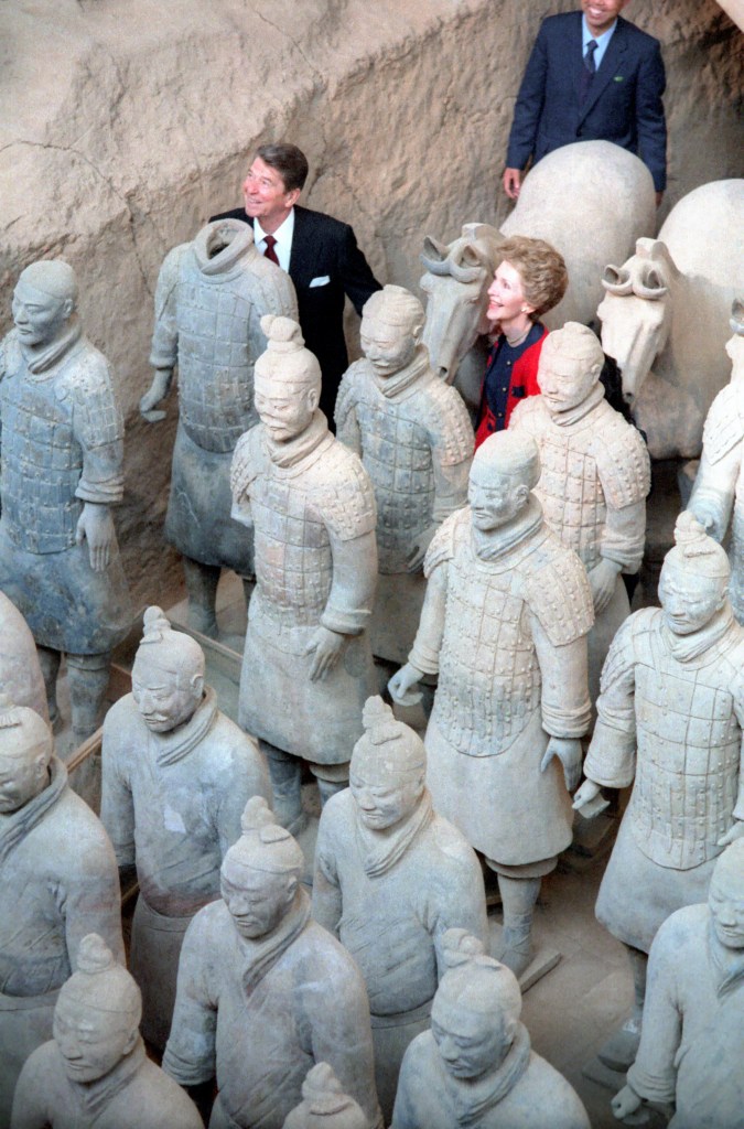 The President and First Lady take Air Force One to Xi’an, the ancient capital of China, and visit the tomb of the first emperor. The President and First Lady tour the excavation site holding the 800 life-size Terra Cotta soldiers guarding the emperor of China’s tomb. Qin Shi Huang, whose tomb President Reagan visited today, was the ruler who first unified China and, while establishing a centralized empire, radically altered the political and social structure. The inclusion of the visit on the Presidential schedule was, like earlier trips by President Francois Mitterrand of France and former Vice President Walter F. Mondale, considered a homage to the history of this ancient civilization. The site, near the 2,200-year-old tomb about 19 miles east of Xi’an, starting point of the Silk Road that for centuries brought traders from the outside world, was discovered by local peasants in 1974. Considered one of the eight wonders of the world, it contains an army of life-sized terra-cotta figures of soldiers and horses. Some 800 of an estimated 8,000 have been excavated to date. In 1980, a further spectacular find was made when two bronze chariots, drawn by life-sized bronze horses and driven by bronze charioteers, were unearthed.