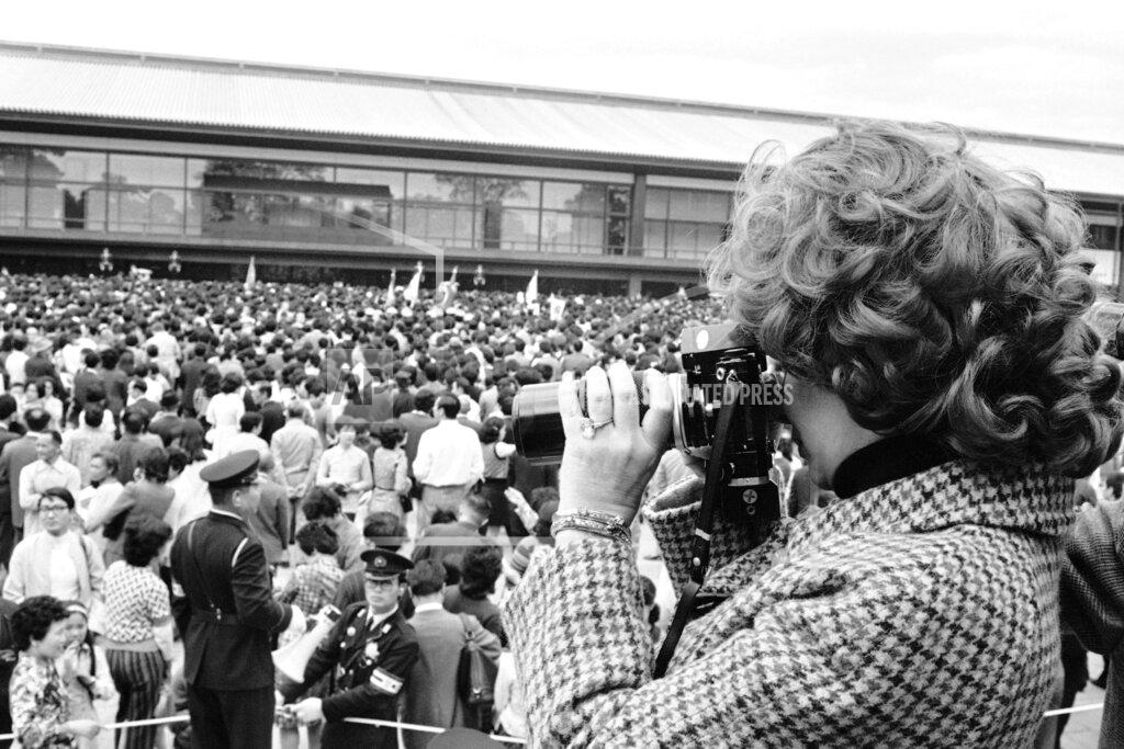 Emperor Hirohito celebrated, his 73rd birthday today, and 55,000 Japanese trooped through the moated confines of the Imperial Palace in a demonstration of the deep emotion and respect the emperor still commands. As the onlookers waved small paper flags bearing the familiar red sun and shouted “Banzai” (“Long life”), the emperor emerged four times during the day to wave back stiffly from a glass‐enclosed balcony of the modern Showa Palace. In contrast with the practice in pre‐World War II years, when the emperor was considered a living god, no one bowed deeply or kept his eyes turned down on the ground. The emperor, a slight, stooped graying man dressed in formal morning coat, was flanked by Empress Nagako, his wife of 50 years, and Crown Prince Akihito and Crown Princess Michiko.