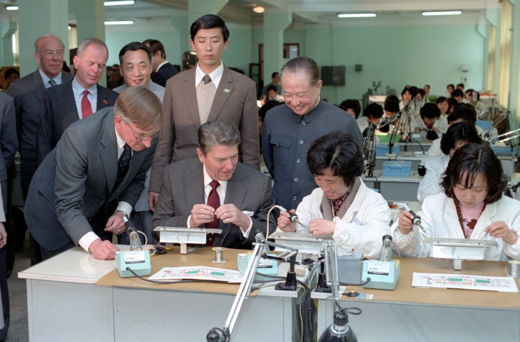 President Reagan tours the countryside of Shanghai. Hundreds of thousands of Chinese jammed the streets of Shanghai to greet President Reagan as he completed his six-day visit to China. Workers in the old commercial city, many apparently given time off, gave Mr. Reagan the biggest reception of his career. Hundreds of thousands of Chinese jammed the streets of this old commercial city to greet President Reagan Monday as he completed his six-day visit to China. Mr. Reagan used the occasion to reiterate American readiness to help the nation modernize and prosper. Workers, many apparently granted time off, gave Mr. Reagan the biggest reception of his career, an outpouring that some said was reminiscent of the one accorded President Nixon when he traveled here to sign a communique opening relations with China in 1972. Mr. Reagan’s first stop Monday was at the Shanghai Foxboro Corporation, China’s first industrial joint venture with an American partner, the Foxboro company of Massachusetts. There Mr. Reagan borrowed a soldering iron from one of 40 workers in white smocks and tried his hand at soldering chips onto a circuit board.