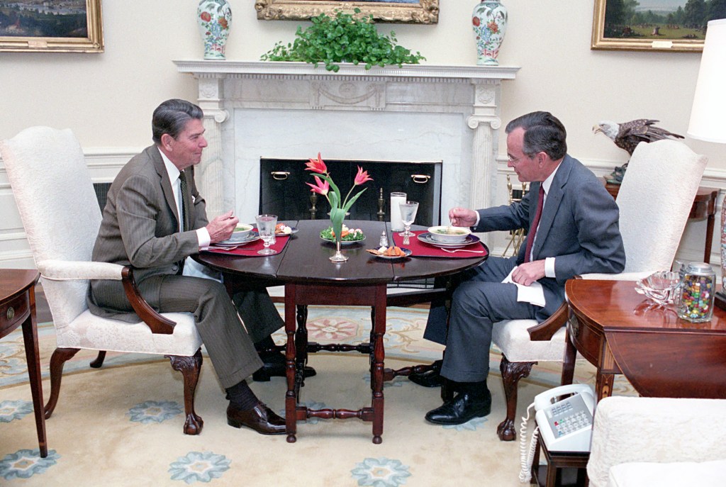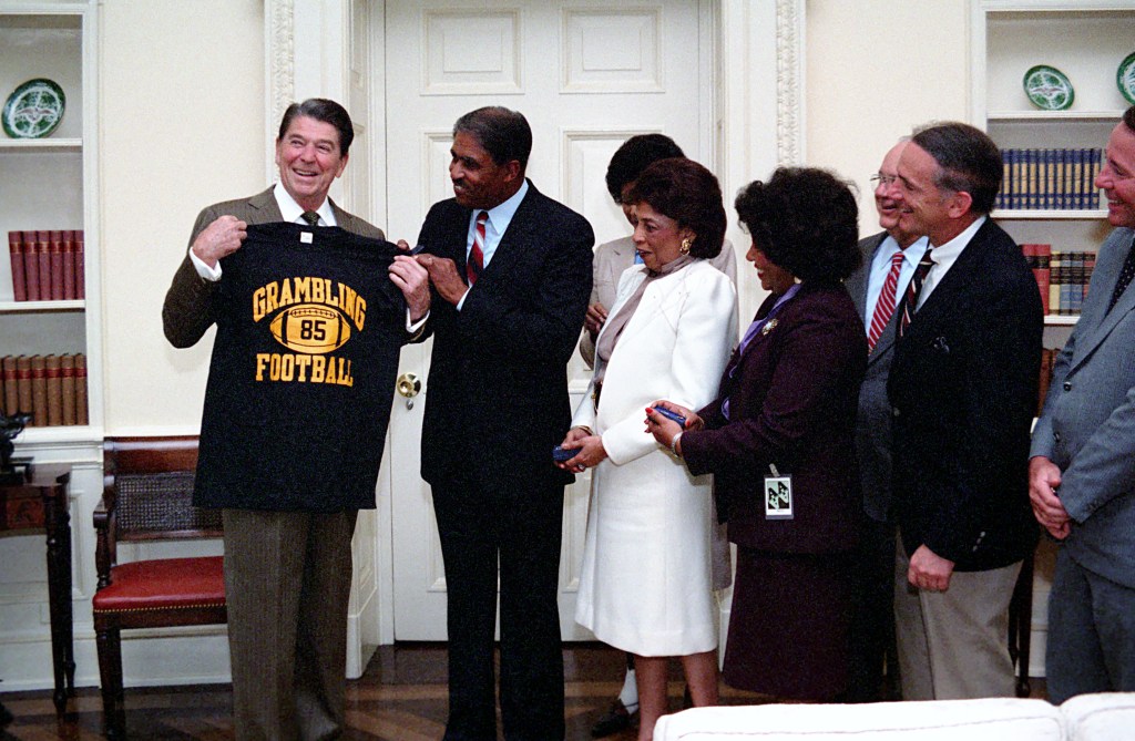 President Reagan meets with head football coach Eddie Robinson of Grambling University.