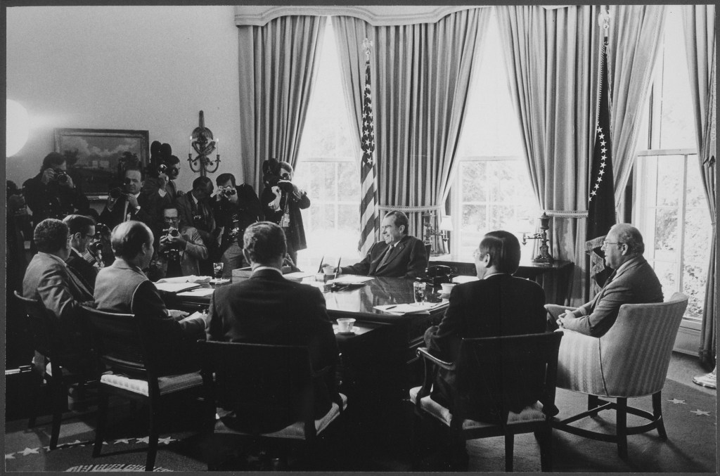 James St. Clair, President Nixon’s chief attorney, announced that the President had decided not to turn over further Watergate tapes to the House Judiciary Committee or to special prosecutor Leon Jaworski. The surprise announcement, at a late afternoon news conference, was made soon after the President’s aides had indicated Mr. Nixon might once again back down in the face of pressure to provide more material.