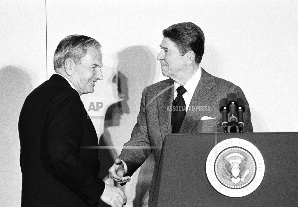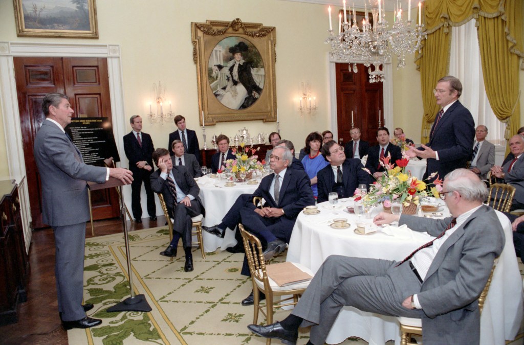 President Reagan hosts a lunch in the State Dining Room observing the 100th birthday of President Truman.