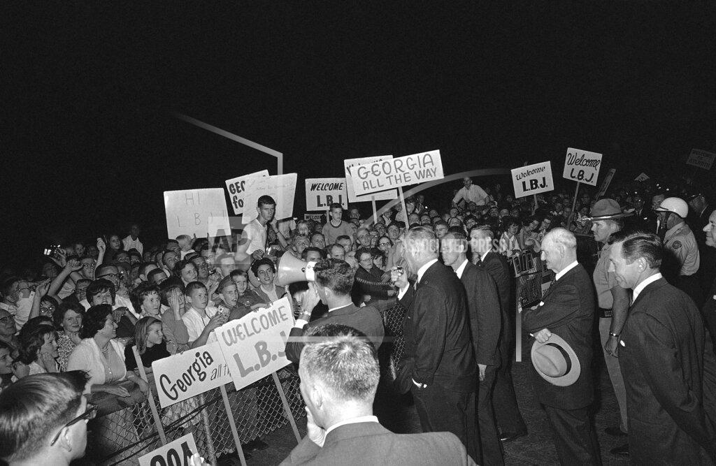 “But I come to you today to speak to you as an American,” Mr. Johnson said in Atlanta. “As I am President of all the people, you are part of all the people. I speak to you, not, therefore, as Georgians, this morning, or as Southerners, but as Americans. Your hopes are the nation’s hopes; your problems are the nation’s problems. You bear the mark of a Southern heritage proudly, but that which is Southern is far less important than that which is American.” Mr. Johnson got an ovation both from the Atlanta audience of more than 1,000 legislators and their guests, and from a crowd estimated at more than 40,000 jammed into every inch of sun‐baked Franklin D. Roosevelt Square in Gainesville. In Atlanta, more than a half-million persons lined 15 miles of streets to watch his motorcade. The crowd was so over, whelming that Police Chief Herbert Jenkins was moved to remark: “I’ve never seen anything like it in 18 years, including Franklin D. Roosevelt and ‘Gone with the Wind.’”