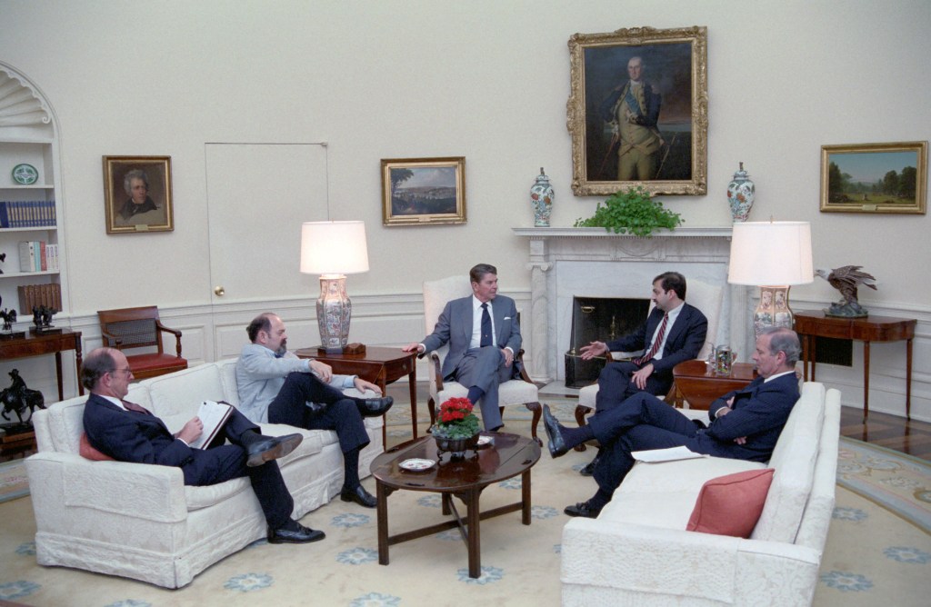President Reagan participates in a meeting with the U.S. Presidential Delegation of Observers to El Salvador’s second round Presidential Election.
