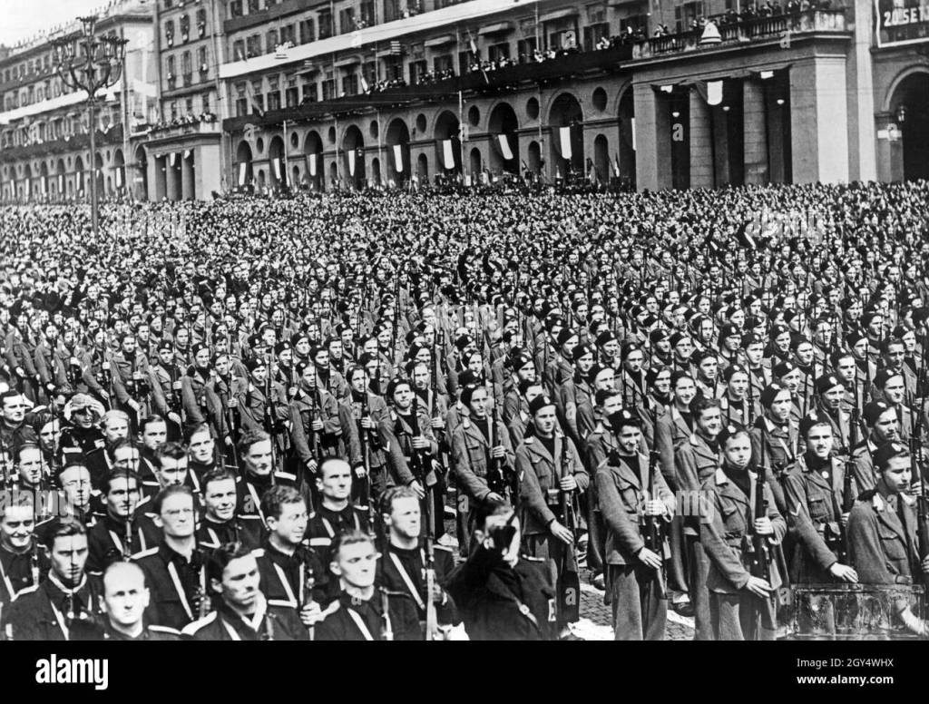 From the foot of the vast podium built in the shape of an M the crowd seemed like a solid black mass with one large burst of color in the center foreground where the various student groups stood. But gradually the color seemed to come out-the white sleeves of the peasant women, the gray green of the militiamen, the blue of the sailors and, in the foreground, the red and yellow sashes of the Squadristi, the Fascist veterans of the early days. In a place of honor just left of the stand was a small group of legionnaires, who had recently returned from Spain, in their khaki field uniforms. Red, white and green streamers ran all around the buildings, the windows and balconies of which were crowded with people.