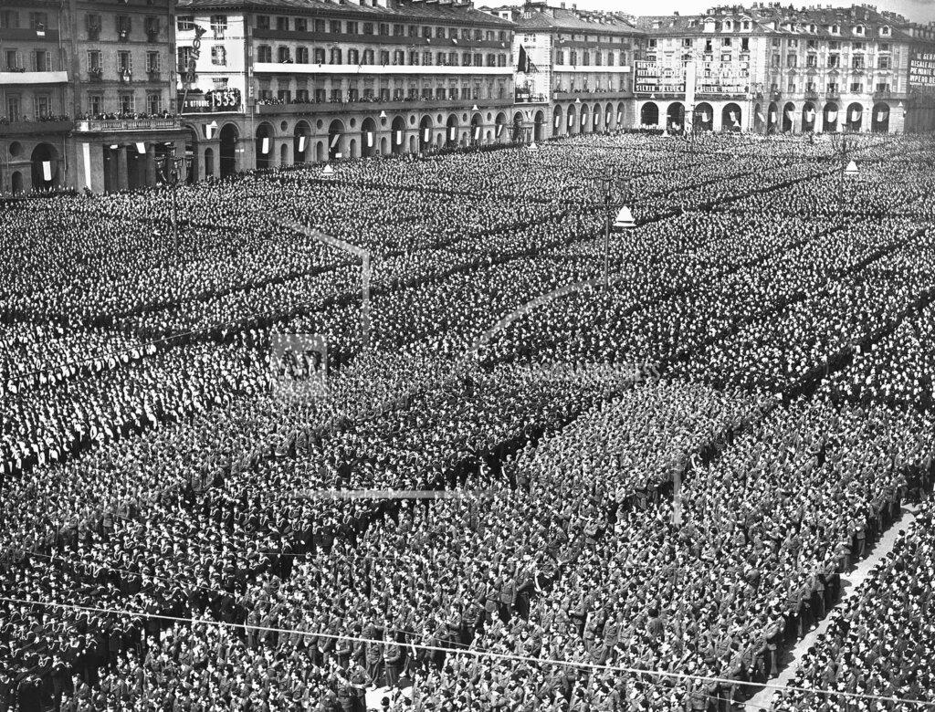 From 4:30 am this morning the city of Turin was kept awake by the tramp of marching men, brass bands and good-natured cheering as the great mass of humanity flowed into the square and took their places. No one who did not belong to some organization of the regime was allowed except a small group of foreign correspondents, who alone were without uniforms and who were incidentally hooted and jeered constantly on the theory that they were at best representatives of the democracies and, at worst, Frenchmen.