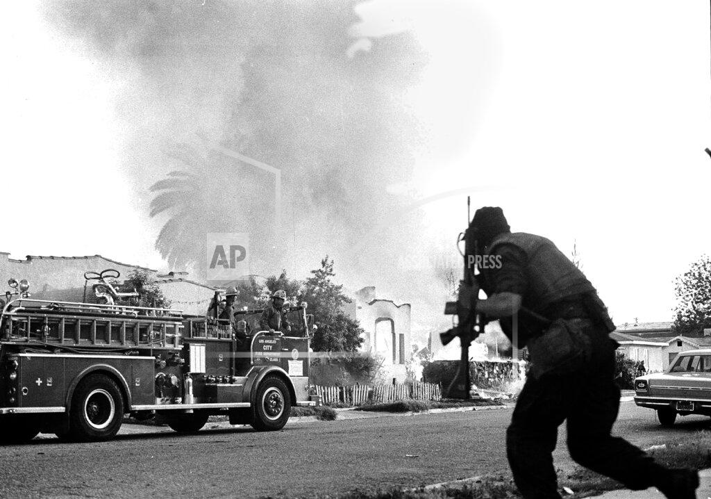 The shooting never ceased during the police assault. There was the pop-pop-pop of the lawmen’s semiautomatic weapons, interrupted at times by staccato bursts of machine gun fire. A police spokesman said it appeared the machine gun fire was coming from the SLA hideout as the lawmen were not using completely automatic weapons. This was borne out by a wavy line of bullet holes — obviously from a machine gun — in the wall of an apartment house across the street from the hideout. At 6:35 pm, officers began to make their way gingerly into the front of the burning building. A police sergeant came upon the bodies of two women. They had cartridge bandoliers strapped to their bodies. Their clothes were on fire. The flames were causing the ammunition in the bandoliers to fire.