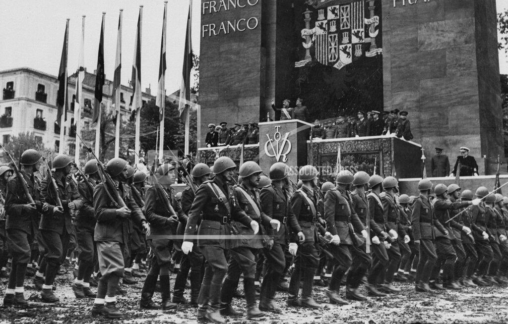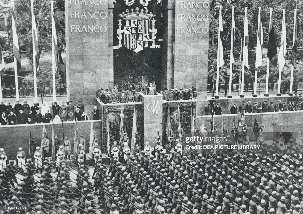 Spanish leader Generalissimo Francisco Franco watched a military parade (desfile de la Victoria de Madrid de 1939) intended as a farewell to the foreign soldiers who helped him win the Spanish Civil War. Italian, German, and Moorish troops joined some 127,000 Spanish soldiers pass Franco in his reviewing stand in Madrid. The foreign troops were expected to be departing Spain by June 5. The parade was commanded by General Andrés Saliquet, Commander of the Madrid Military Region, and was presided by the Franco.