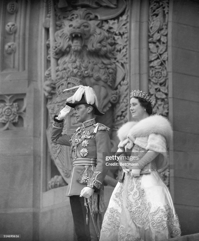 Queen Elizabeth laid the cornerstone for the new Canadian Supreme Court building. While Queen Elizabeth perpetuated one fiction in stone today, King George VI, in scarlet tunic, skin tight braided black trousers and high busby of a colonel of the Coldstream Guards, indulged in another sort of make-believe, pretending that it was his forty-fourth birthday anniversary, although he actually was born on December 14, 1895.