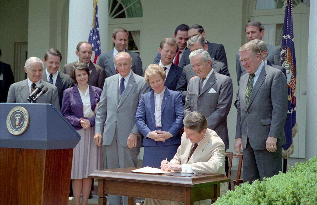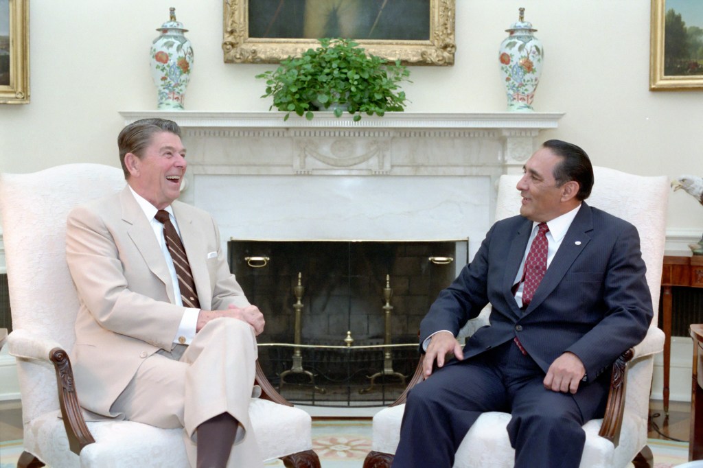 President Reagan welcomes and meets with President-elect Jose Napoleon Duarte of El Salvador. Duarte pledged he “will never” request that United States troops fight in El Salvador. At the same time, the Salvadoran President-elect appealed to Congress to approve more aid for his country now without attaching what he called degrading conditions. A telephoned bomb threat briefly delayed Mr. Duarte’s speech at the Washington Hilton Hotel. The police cleared and searched the hall while outside about 200 protesters shouted slogans against American involvement in Central America and Mr. Duarte’s appeals for more aid. In his speech, Mr. Duarte called on Congress to adopt the Reagan Administration’s five-year, $8 billion aid program for Central America, including $178 million in military aid for El Salvador this year.