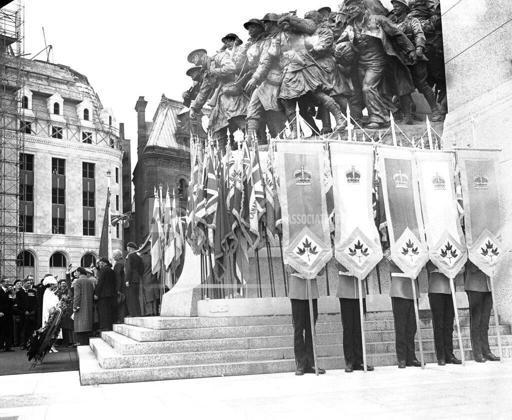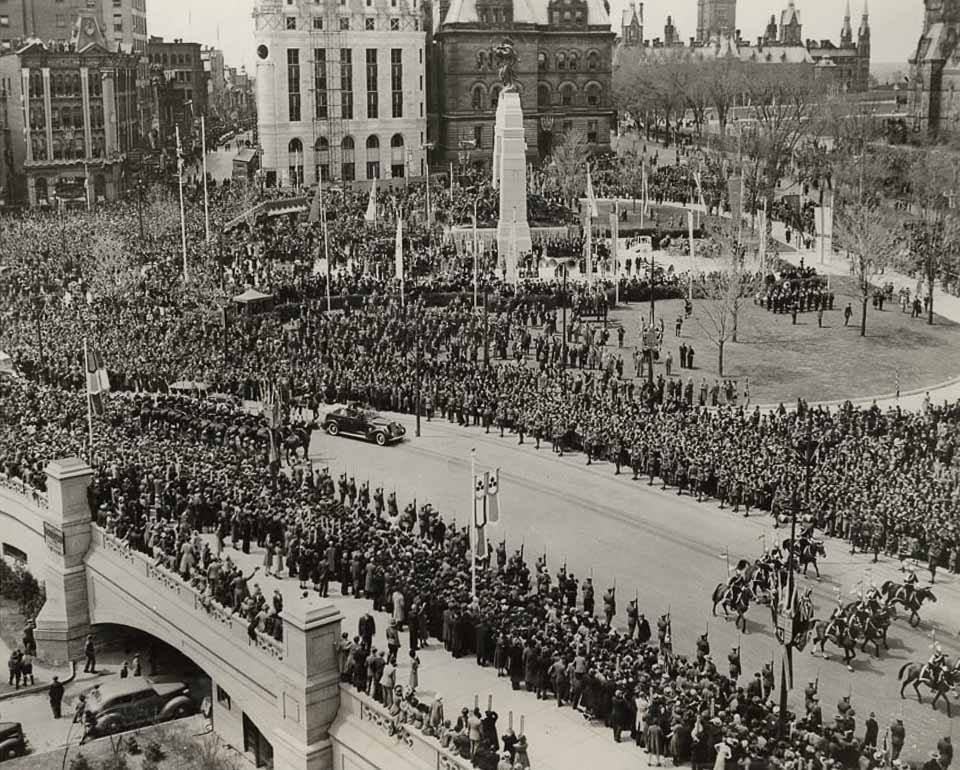 George VI dedicated Canada’s National War Memorial. King George VI left the people of Ottawa, capital of his vast dominion beyond the sea, today with the message that “without freedom, there can be no enduring peace, and without peace, no enduring freedom.” These were the words of the ruler of one of the greatest empires in history as he unveiled a monument to those who fell in the last war for democracy before a crowd of more than fifty thousand in Connaught Square.