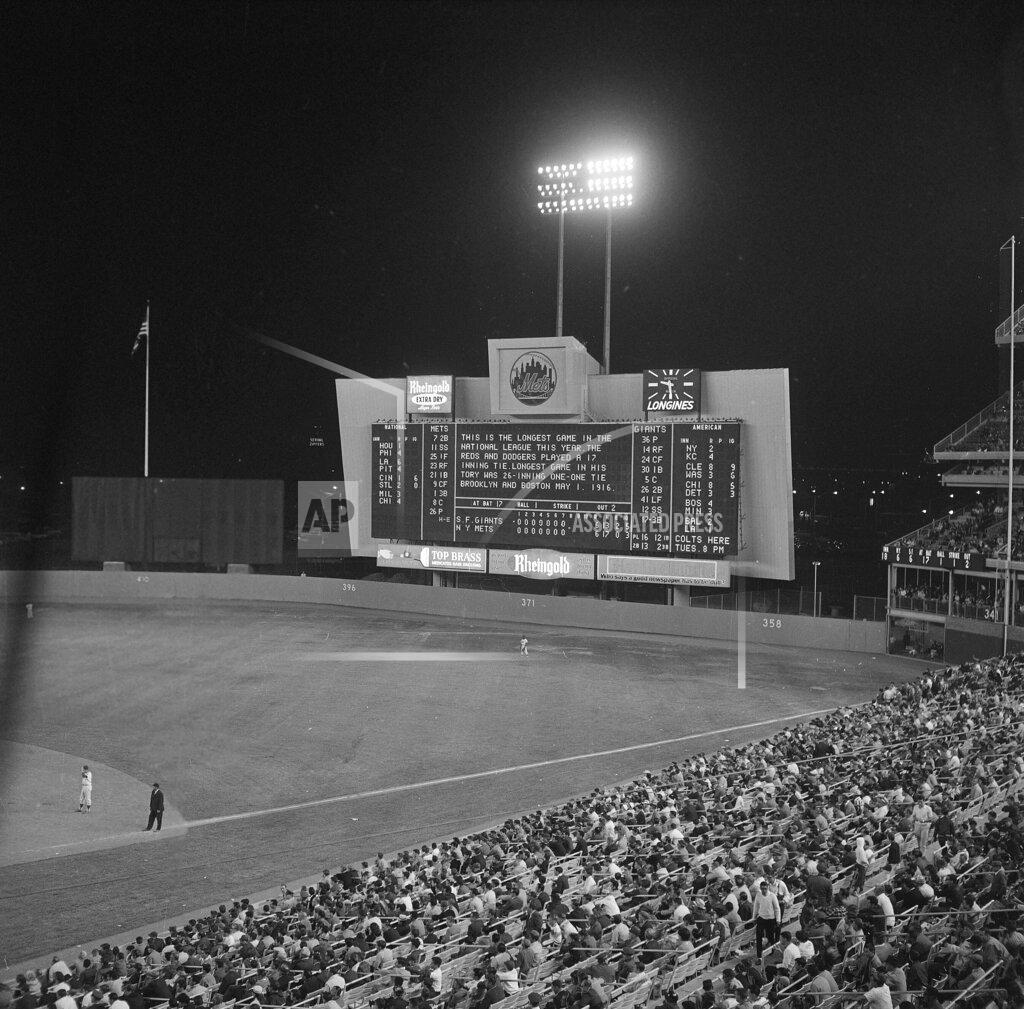 The longest game in Major League Baseball history, up to that time, ended at Shea Stadium in New York at 11:24 pm, seven hour and 23 minutes after it had started, with the San Francisco Giants beating the New York Mets, 8 to 6, in the 23rd inning. The game was the second of a doubleheader between the Mets and Giants that day (the Giants won the first one, 5 to 3), and the personnel and fans who had chosen to stay for both contests were in the park for more than ten hours. Before 57,037 at the Polo Grounds, the Mets and Giants square off in a Memorial Day doubleheader that starts at 1 pm and doesn’t conclude until 11:24 pm. After Juan Marichal’s 5–3, first-game win, San Francisco holds a 6–1 lead in the 2nd until New York rallies for 5 to tie in the 7th. The big blow is Joe Christopher’s 3-run homer that bounces off Mays’ glove over the fence. Mays ends the game at shortstop.