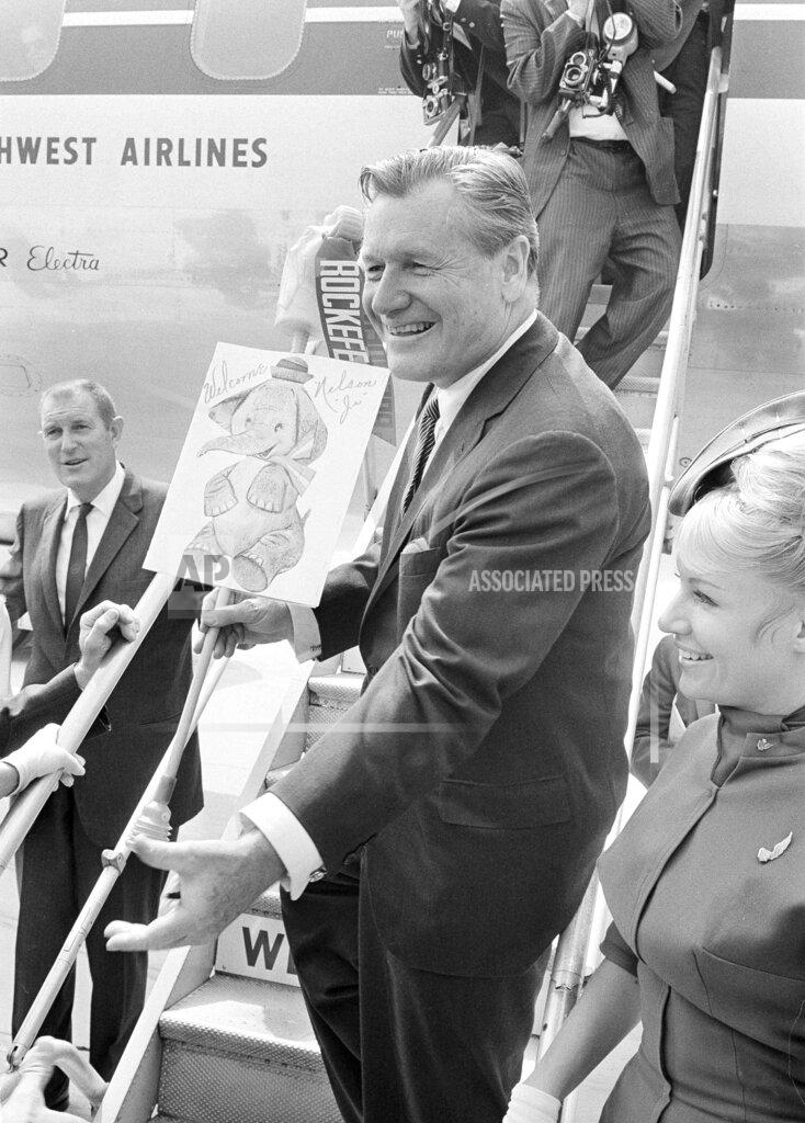 Governor Rockefeller faced down one of the more unruly crowds of his political career tonight in an improbable scene in the Los Angeles airport. It was at the end of his California primary campaign. He was met by about 700 persons. Half of these seemed to be supporters of Senator Barry Goldwater who had stayed behind for a rally at the airport after the Senator’s arrival earlier from Washington. The police had asked for reinforcements before the Governor’s chartered plane arrived at the end of a 1,250‐mile trip that took him to 11 California cities today. The Governor was interrupted frequently by Goldwater hecklers who carried signs and portraits of the Senator.