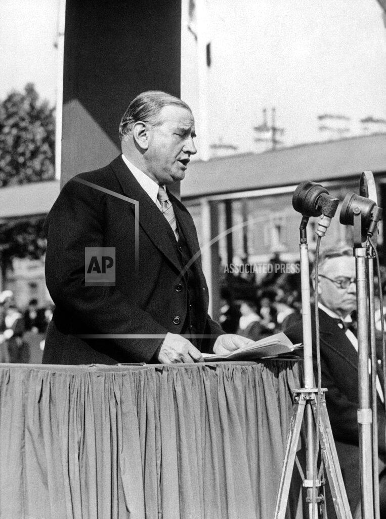 The pages of history flicked back yesterday and the moving picture of time projected a scene from the dead past into the unknown World of Tomorrow. On Flushing Meadows, where the redcoats of King George III fought the ragged Continentals a century and a half ago, King George VI reigned for an afternoon, with Queen Elizabeth by his side, over the little principality known as the World’s Fair. As the young, solemn King and his smiling Queen drove through the Fair Grounds to the thunder of guns, the roar of cheering crowds, the crash of band music, the playing of colored fountains, the display of fireworks and the waving of flags, Grover A. Whalen, monarch of the realm of the Trylon and Perisphere, abdicated for the day. He gave them the key to his domain in the form of a gold and crystal Trylon and Perisphere, and the populace accepted the temporary rulers by acclaim.
