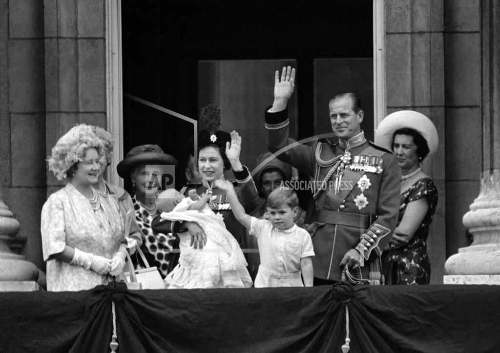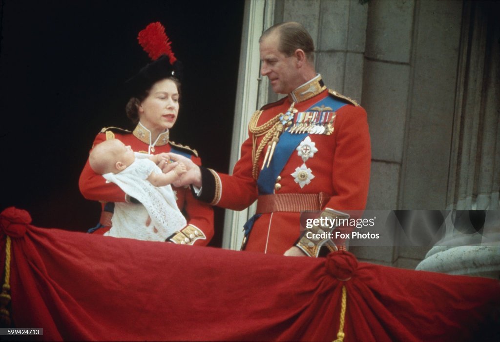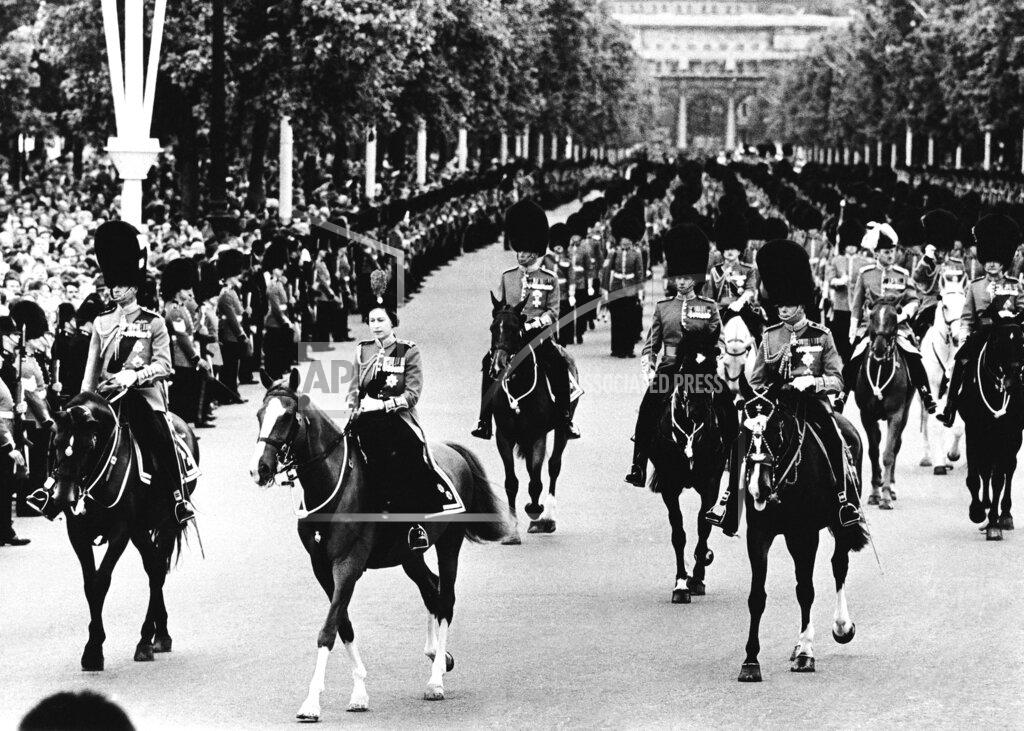 Tens of thousands of spectators, including a big contingent of American and other foreign tourists, jammed the Mall and the parade ground. There were lowering clouds following early‐morning showers but no rain fell and the sun peeped through a couple of times to flash on swords and gleaming helmets. Returning to Buckingham Palace, the Queen appeared on a balcony with her 12-week‐old son Prince Edward in her arms to watch the fighter planes fly past. His brother Prince Andrew, 4, was so fascinated by the cheering crowds that he leaned far out over a balustrade until he was pulled back by an attendant. The Queen’s birthday is April 21. Her official one makes place now in the hone of dry weather.