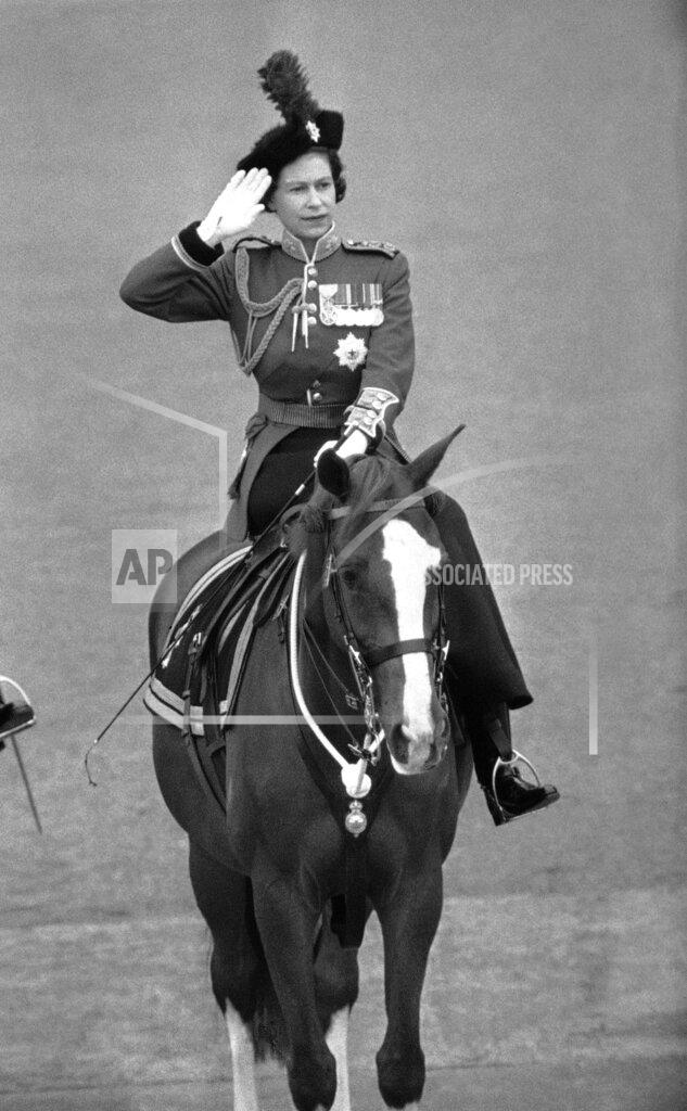 Troops marched in colorful regalia, jet planes roared overhead and ceremonial guns boomed today to honor Queen Elizabeth II on her official 38th birthday. The centerpiece of the celebration was the annual rite of Trooping the Colour at Horse Guards’ Parade, a quarter of a mile down the Mall from Buckingham Palace. The Queen, riding sidesaddle on a police horse named Imperial and accompanied by Prince Philip and her uncle, the Duke of Gloucester, took the salute from more than 1,500 troops honoring, this year, the flag of the First Battalion, the Coldstream Guards.