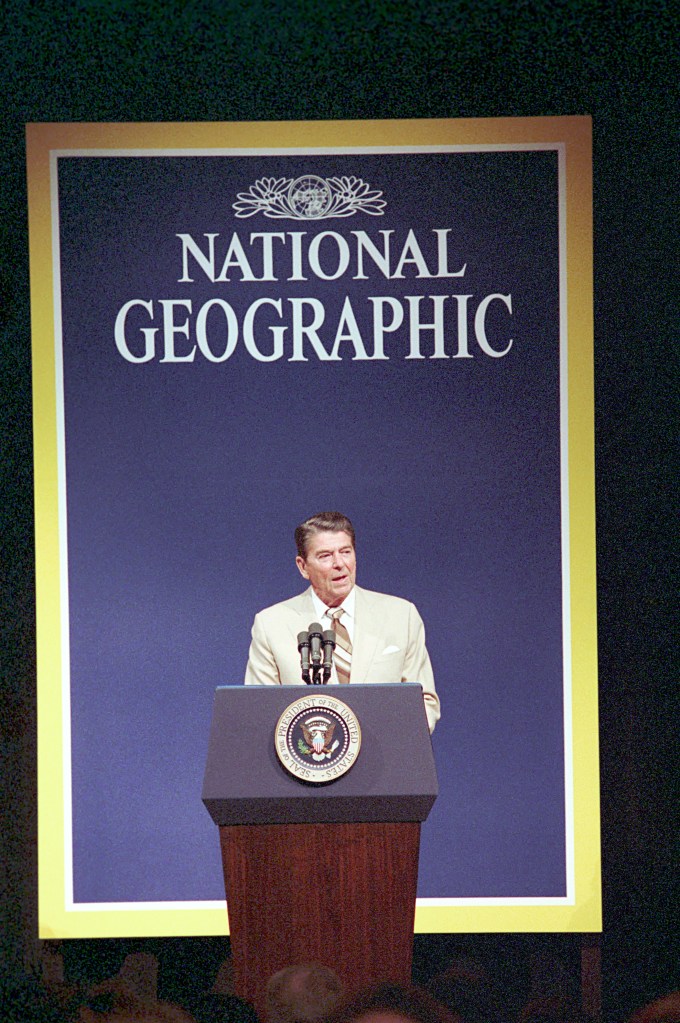 President Reagan participates in the dedication ceremony for the new National Geographic Society’s building. President Reagan defended his environmental record today, claiming “great progress” in the year since a management scandal forced widespread changes in the Environmental Protection Agency. The President, addressing the National Geographic Society on an issue that is a source of heavy Democratic criticism in the Presidential campaign, also denounced his conservationist critics as making “ignorant attacks on the entrepreneurs who help the economy grow.” Calling for a balance between business and conservation interests, Mr. Reagan urged the nation to “rid our minds of cant, of empty rhetoric, of mere politics” in considering the environmental issue.