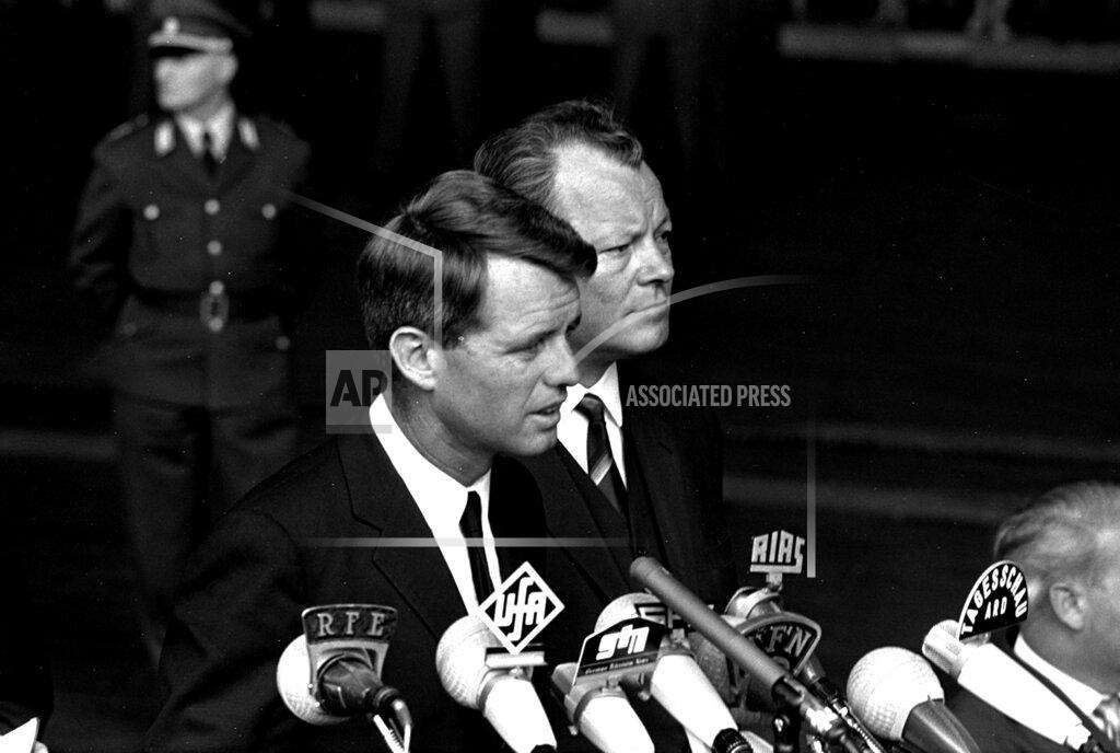 Attorney General Robert F. Kennedy evoked today the image and the words of his brother in a return visit to West Berlin on the anniversary of President Kenney’s triumphal reception. A crowd of 70,000 saw Mr. Kennedy unveil a bronze memorial plaque on the facade of the West Berlin City Hall, and heard him reaffirm the United States’ pledge to defend the freedom of West Berlin. Throngs estimated at 300,000 lined the streets to applaud the Attorney General as he made his way through the city, visiting a school, a factory and a United States military housing development. The holiday atmosphere was reminiscent of the joyous greeting accorded President Kennedy. The Attorney General accompanied by his wife and three other children, retraced much of the route that President Kennedy followed on June 26, 1963 —the day he won Berliners’ hearts by saying: “I am a Berliner.” The Attorney General recalled those words as he spoke from the same position in the city hall square, now renamed John F. Kennedy Square.