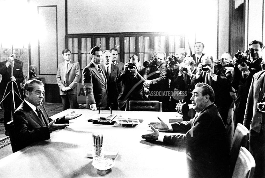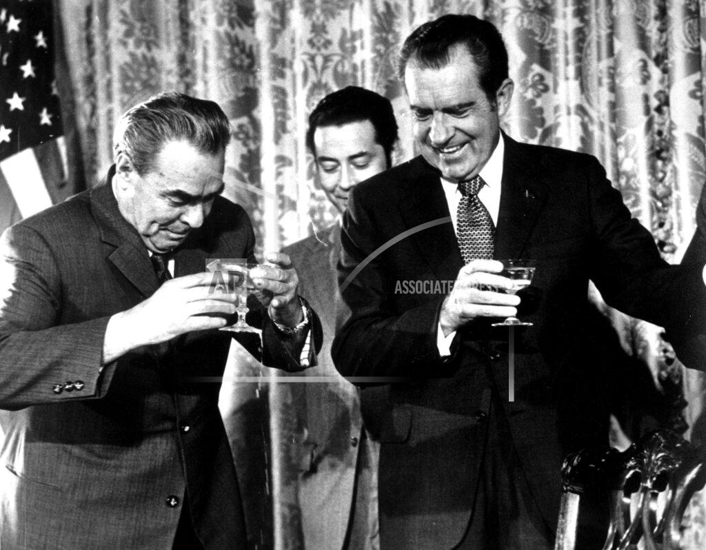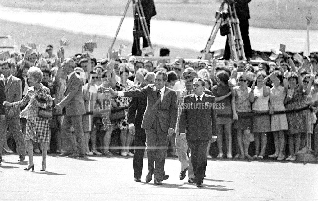 Soviet leader Leonid Brezhnev welcomed U.S. President Richard Nixon to Moscow for the third summit between the two leaders, and then hosted him at a banquet at the Kremlin, where the two raised toasts to their personal friendship and for reaching detente between the two superpowers. The “strengthening of universal peace” was pledged in Moscow by President Nixon and Leonid Brezhnev, the Soviet leader. Mr. Nixon was warmly welcomed as he arrived for his third summit meeting with Mr. Brezhnev. A dinner was given for Mr. Nixon in the Great Kremlin Palace, and in an exchange of toasts he and Mr. Brezhnev expressed hope that significant progress could be made in the control or nuclear weapons. Mr. Brezhnev spoke out against critics of detente in the United States.