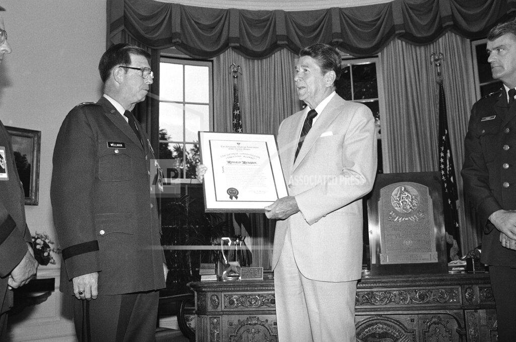 President Reagan receives the first George Washington Award from a group of National Guard Generals.