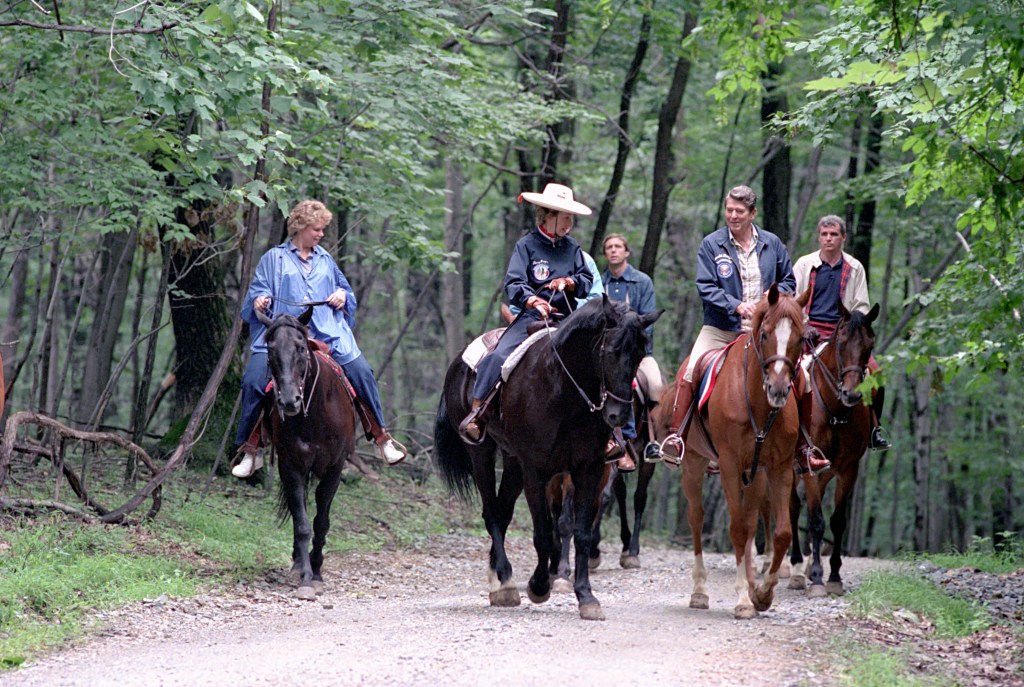 President Reagan participates in a photo opportunity with members of the Army Herald Trumpeters on their 25th anniversary.