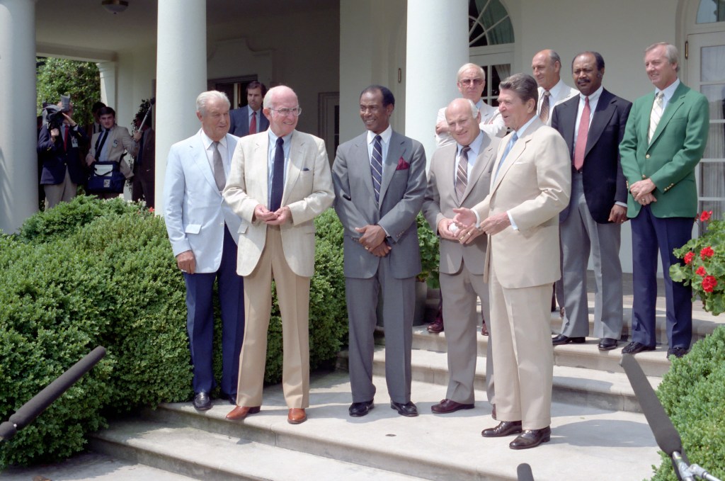 President Reagan receives a signed baseball of all the Cracker Jack Old Timer Baseball Classic players.