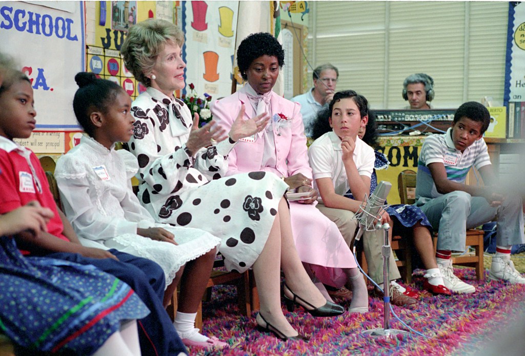 First Lady Nancy Reagan met with a group of elementary school students and their parents today to talk about ways to fight drug abuse, one of the biggest problems facing the city of Oakland, California. Mrs. Reagan watched a 13-minute film and then joined in a group discussion at Longfellow Elementary School, just a few blocks away from a part of town where drugs and prostitution are prevalent.