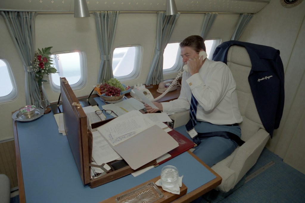 President Reagan meets with the Soviet Ambassador to the United States, Anatoly Dobrynin. Mr. Reagan and Mr. Dobrynin sat next to each other Sunday at a White House barbecue for diplomats and engaged in animated conversation. Asked if his talks in Washington left him encouraged or disappointed, Mr. Dobrynin said: “You are going too far; it is diplomacy.” Earlier in Washington, he said the talks were “useful.”