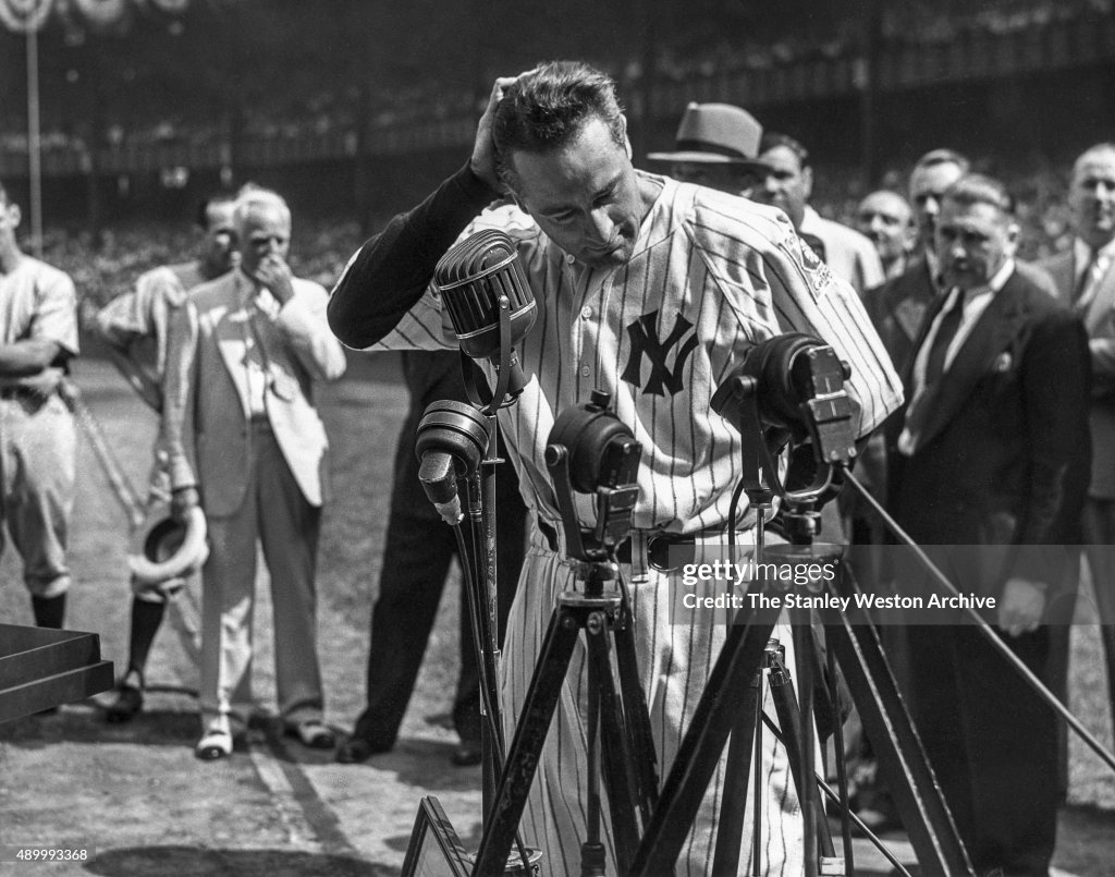 “Fans, for the past two weeks you have been reading about a bad break I got. Yet today I consider myself the luckiest man on the face of the earth. I have been in ballparks for seventeen years and I have never received anything but kindness and encouragement from you fans. Look at these grand men. Which of you wouldn’t consider it the highlight of his career just to associate with them for even one day? Sure, I’m lucky. Who wouldn’t consider it an honor to have known Jacob Ruppert? Also, the builder of baseball’s greatest empire, Ed Barrow? To have spent six years with that wonderful little fellow, Miller Huggins? Then to have spent the next nine years with that outstanding leader, that smart student of psychology, the best manager in baseball today, Joe McCarthy? Sure, I’m lucky. When the New York Giants, a team you would give your right arm to beat, and vice versa, sends you a gift, that’s something. When everybody down to the groundskeepers and those boys in white coats remember you with trophies, that’s something. When you have a father and mother who work all their lives so that you can have an education and build your body, it’s a blessing. When you have a wife who has been a tower of strength and shown more courage than you dreamed existed, that’s the finest I know. So I close in saying that I might have had a bad break, but I have an awful lot to live for. Thank you.”