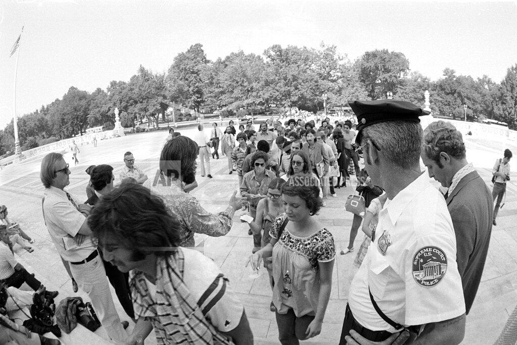 Watergate prosecutor Leon Jaworski and U.S. President Nixon’s attorney James D. St. Clair appeared before the U.S. Supreme Court to make oral arguments on the issue of whether Nixon’s refusal to release 64 tape recordings, relevant to the Watergate scandal, were protected by executive privilege. After three hours of tense argument and persistent legal questioning, eight Justices of the Supreme Court reserved decision on two questions that could materially affect the possibility of both President Nixon’s impeachment and the conviction of his former aides for concealing the Watergate burglary. The Justices heard arguments by James St. Clair, the President’s defense lawyer, and Leon Jaworski, the Watergate special prosecutor.