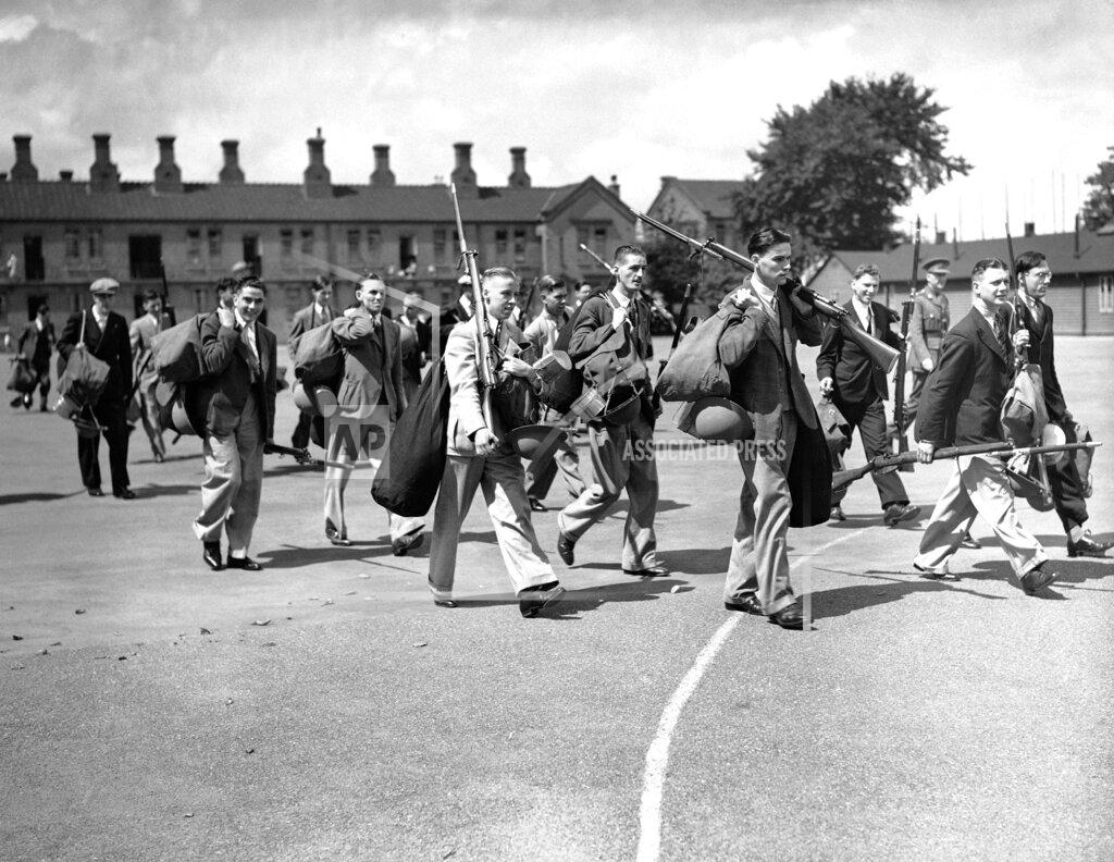 As the long call of “Last Post” rang out over camps and barracks at 10 o’clock tonight, followed fifteen minutes later by the short bugle call for “lights out,” 30,000 young Britons had ended their first day as soldiers. They were the vanguard of 200,000 conscripted militiamen. Few of these 20-year-olds had been Away from their homes for more than a fortnight before. Big crowds of relatives and friends saw them off at railroad stations this morning. The youths, excited at the prospect of their new life, quickly found new acquaintances on the way to their depots. As they exchanged their impressions of what army life would mean the accents ranged from broadest Scottish to Cockney.