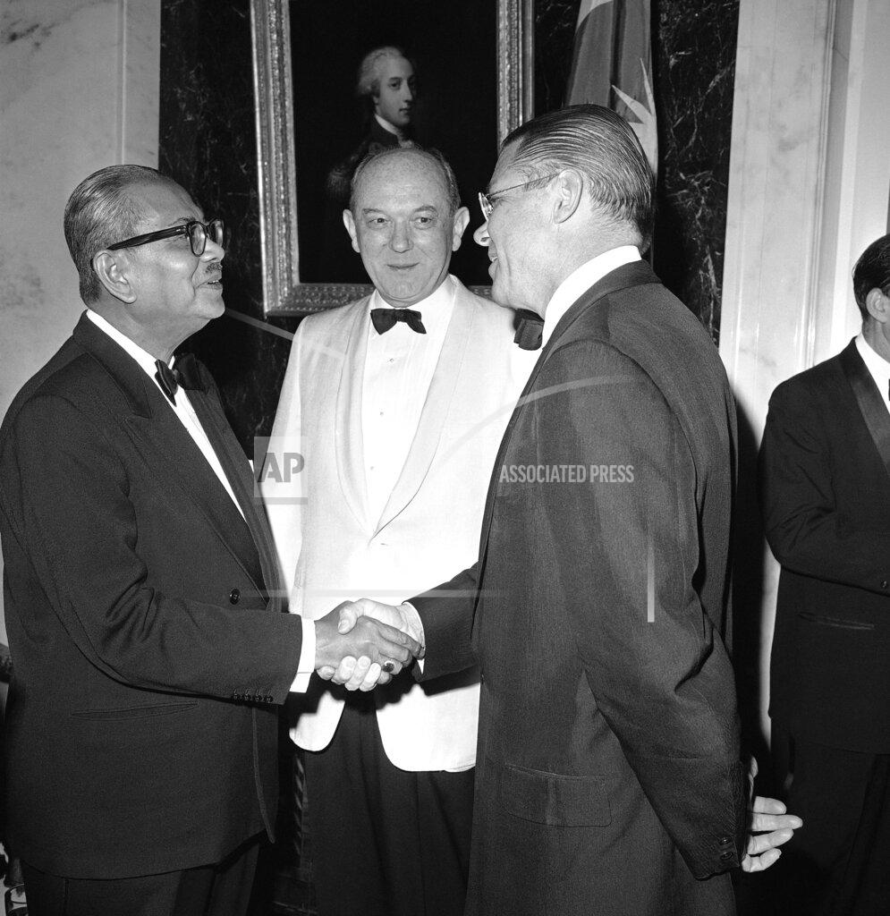 The 61‐year‐old, English-speaking Malaysian leader received a 19‐gun salute on the lawn of the White House. He arrived by helicopter from Williamsburg, Virginia, where he began his 12‐day tour, including two days here. He conferred with President Johnson for an hour and will see him again tomorrow. The Prime Minister said he had asked for the military equipment to help Malaysians defend 1,000 miles of threatened border with Indonesia. “Thirty, twenty, ten planes would be a great help,” he said. “I came here to purchase, perhaps on long‐term credit, or short‐term, whatever is possible.” He said he hoped to have an answer before leaving Washington on Friday. The purchases were discussed at the Pentagon today by Defense Secretary Robert S. McNamara and Kadir Shamsudin, permanent secretary in the Malaysian Defense Ministry.
