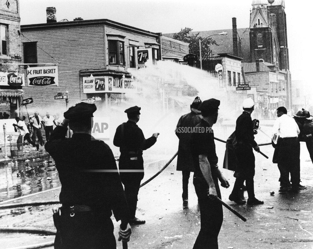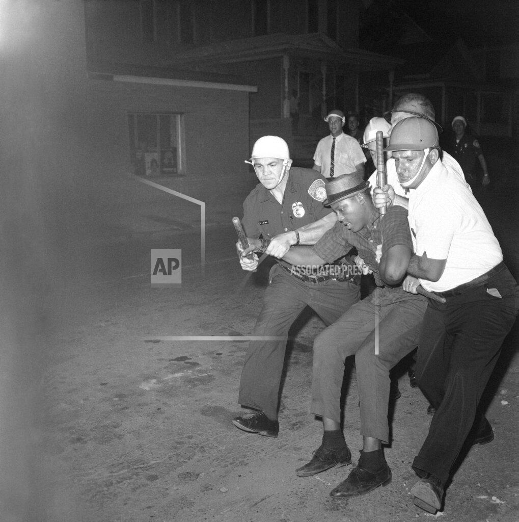 Tonight’s outbreak was centered on the intersection of Jefferson and Bartlett Streets, a neighborhood of well‐kept homes. Black residents, some holding cans of beer, hooted and jeered at the police as they moved in military formation down the streets. Groups of Blacks were reported speeding from one part of the city to another in autos, smashing windows and looting shops. Two white men in an auto were arrested for carrying guns. The police found a shotgun and a rifle in the car. Another rifle was found strapped under the car. Police investigated reports of looting in the Central Park section, west of the new outbreak. On Jefferson Avenue, boulders were placed across the street to keep out the police. One patrolman was struck on the ankle by a brick and limped out of formation. The interiors of a restaurant and grocery nearby were virtually destroyed by looters. All the windows were shattered and furniture and merchandise were hurled into the street.