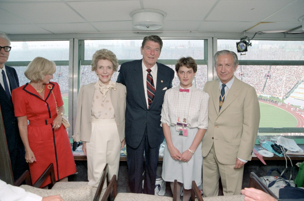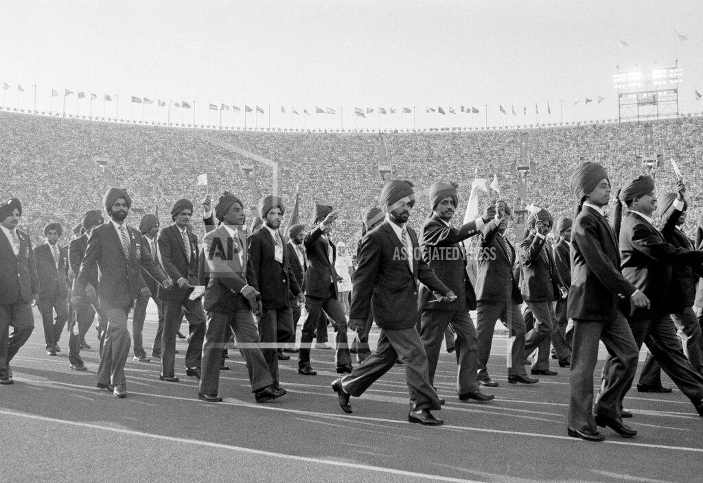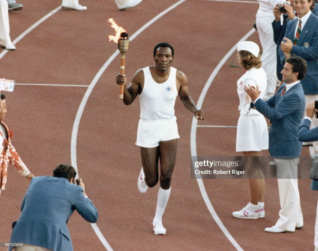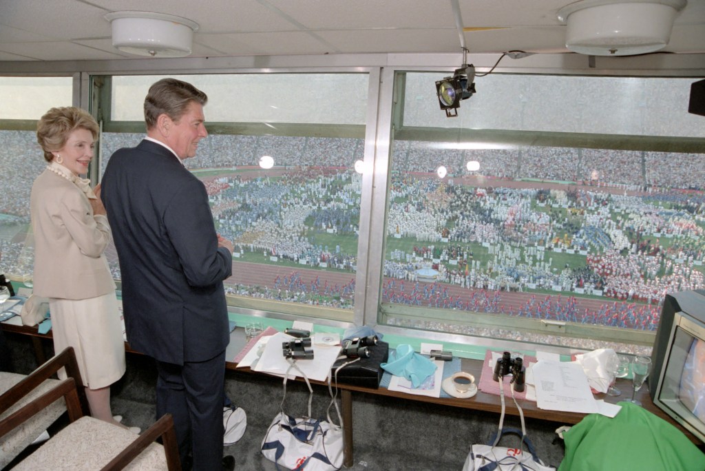President Reagan participates in the opening ceremonies for the Los Angeles Olympics. The Games of the XXIII Olympiad began tonight with spectacular and colorful opening ceremonies and two final torchbearers instead of one. Most of the 7,000-plus athletes from 140 nations marched in an 80-minute parade, many resplendent in native costumes. There was entertainment by 12,000 dancers and musicians. There was live and recorded music, pennant waving and a magnificent card stunt. And there was more excitement for the capacity crowd of 93,000 that sat through 80-degree heat in the Los Angeles Memorial Coliseum. Tickets cost $50 to $200, and the show seemed well worth it. Perhaps the most distinguished participant was President Reagan. He visited with the United States team in the morning and formally opened the Games at night in a 12-second speech, though he reversed the parts of that traditional opening sentence.