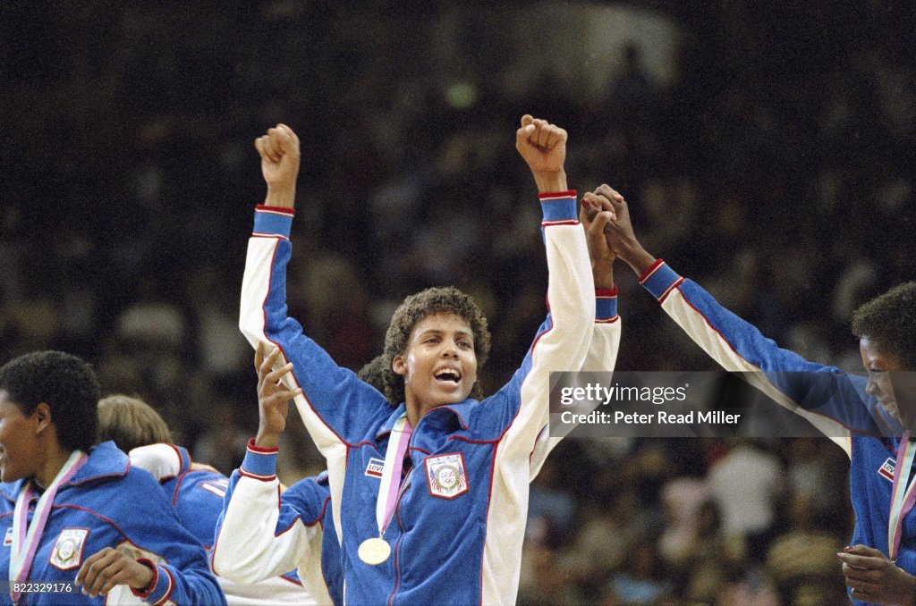 The U.S. collects its first Olympic gold medal in women’s basketball history with a 85-55 win over South Korea in the final at the Los Angeles Games. The United States, with its main competition at home in the Soviet Union, easily won its first gold medal in women’s basketball tonight, defeating South Korea. The Americans controlled the game with their work on the backboards, where they outrebounded the South Koreans, 46-20. The Americans held a 3-to-1 advantage in offensive rebounds, and repeatedly used second and third shots to help build a lead that grew to its high of 30 points in the final seconds. Despite that severe disadvantage, South Korea came within 10 points with 15 minutes 50 seconds to play, but then Cheryl Miller led a 14-0 spurt that put the United States in control. Miss Miller scored 16 points to lead the Americans. She made 7 of 10 shots, grabbed 11 rebounds, and had 5 assists. She was the tournament’s leading scorer with an average of 16.5 for the six games, and was the inspiration for one of the two displays at the end of the game.