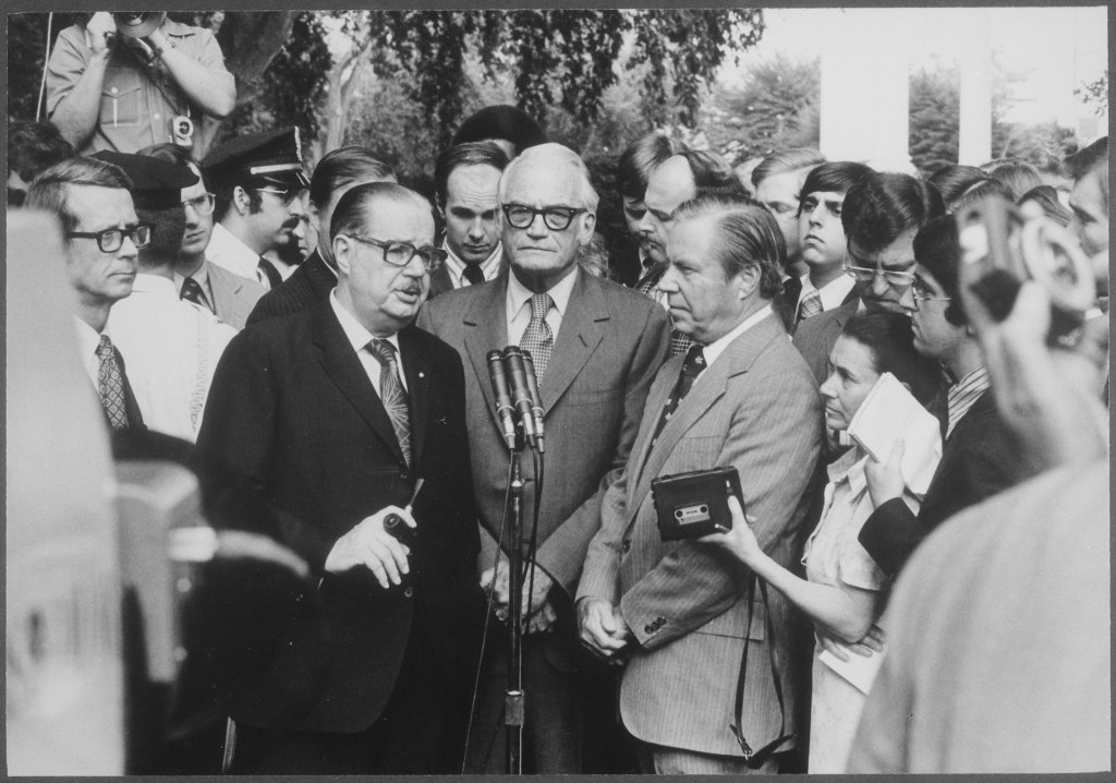 Three Republican leaders met with President Nixon and gathered that he was leaving open the possibility of resignation. He told them his decision would be based on the national interest. Under mounting pressure to resign from members of Congress and of his staff, he asked Senator Hugh Scott, the Republican leader, Senator Barry Goldwater and Representative John Rhodes, the House Republican leader to meet him in the Oval Office. Mr. Rhodes found him “in good spirits and good health, and as four old friends we talked over a very distressing situation.”‘