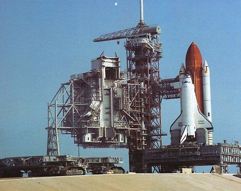 The NASA STS 41-D launch vehicle with orbiter Discovery again moves out to the launch pad. The space shuttle Discovery, thwarted in its first two attempts to launch its maiden voyage, was hauled back to the launch pad Thursday for a third try with a double payload-slated for August 29. Mounted atop the space agency’s ponderous crawler-transporter, it took about seven hours for the shuttle to complete the 3-mile trip to the elevated concrete pad after leaving the huge Vehicle Assembly Building at 11:36 pm EDT Wednesday. Workers at the Kennedy Space Center planned to spend the rest of the day hooking up various electrical and mechanical connections between the shuttle and ground facilities.