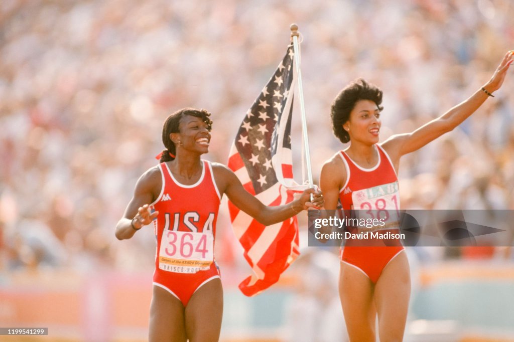 Valerie Brisco-Hooks beats fellow American Florence Griffith to win the 200m gold at the LA Olympics; completes the 200-400m double. Two years ago, Mrs. Brisco-Hooks had just given birth to a son and was 40 pounds overweight. At her husband’s urging, she started running again. The gold medal was the eleventh for the United States in the first six days of Olympic track and field. It was the eighth final in which Americans had finished first and second. One of those was a 1,2,3 finish Wednesday night in the men’s 200-meter dash.