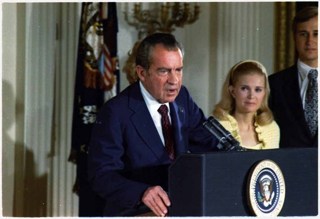 U.S. Vice President Gerald Ford was sworn in as the 38th President of the United States upon Richard Nixon’s resignation. In a speech after being sworn in, President Ford said, “My fellow Americans, our long national nightmare is over.”