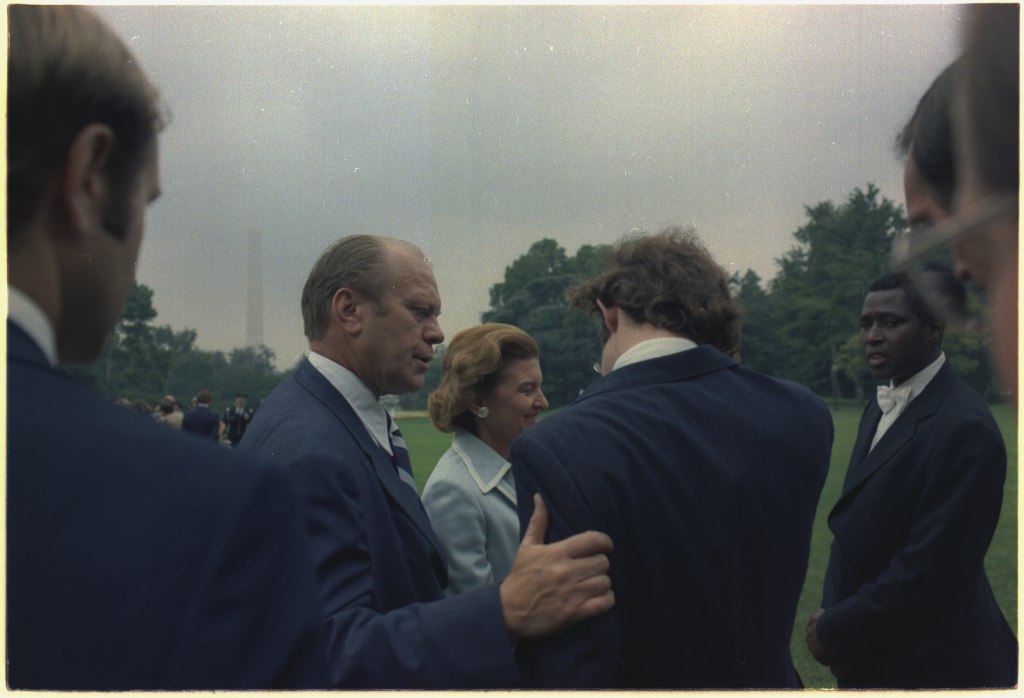 Gerald Ford assumed the presidency at 11:35 AM today, the moment that former President Nixon’s letter of resignation was handed to Secretary of State Kissinger. Twenty-eight minutes later, at 12:03 PM, the 38th President of the United States took the oath of office administered by Chief Justice Warren Burger in the East Room of the White House. Friends, cabinet members and congressional colleagues from both parties crowded the room, where barely two hours earlier Mr. Nixon bade an emotional goodbye to his cabinet and top aides.