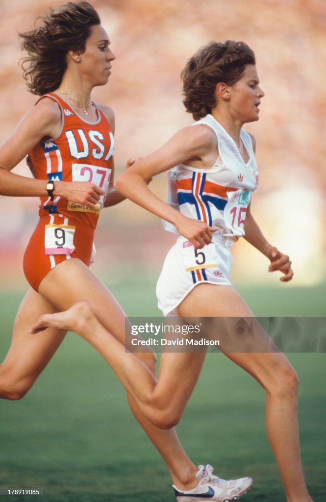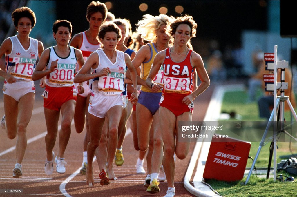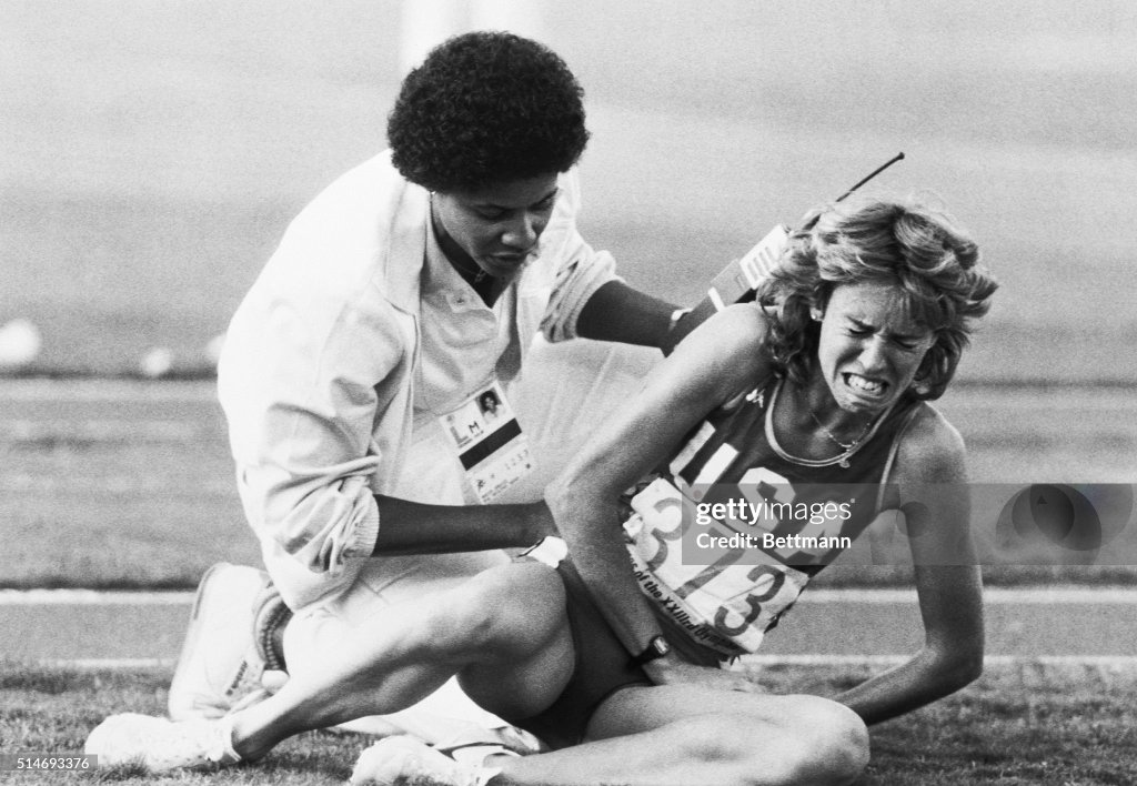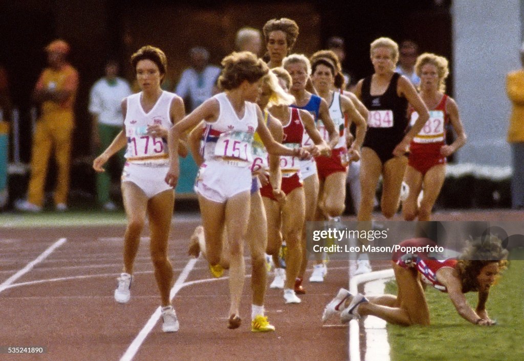 [Mary Decker goes down hard, injured. Zola Budd is shaken and distracted and finishes well back.]
