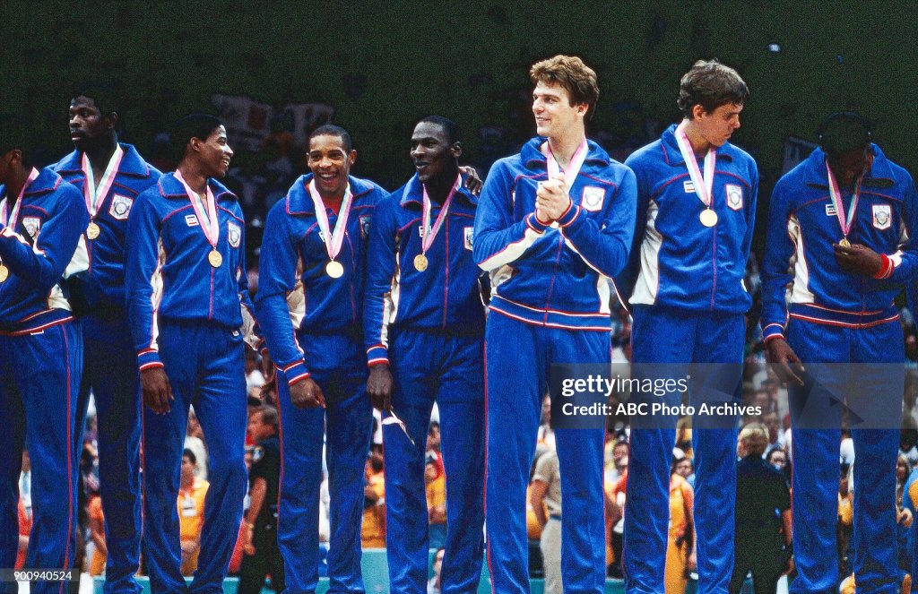 The U.S. beats Spain 96-65 to win the men’s basketball gold medal at the Los Angeles Olympics; future ‘dream team’ members Michael Jordan, Patrick Ewing and Chris Mullin feature.
