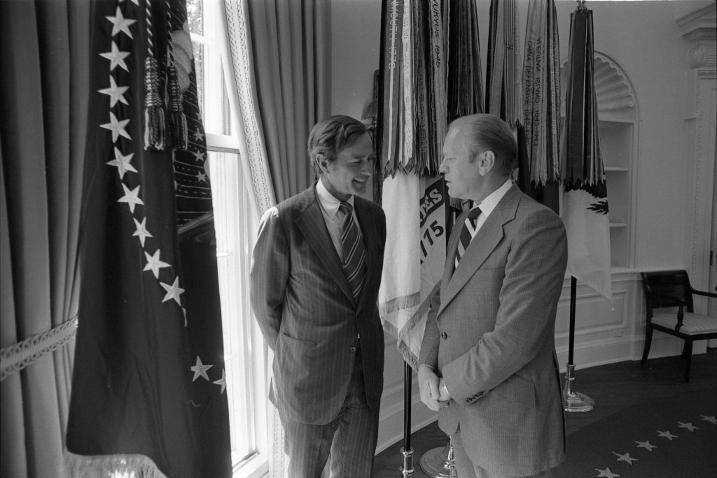 President Ford went to church, but spent the rest of Sunday at the White House conferring with Republican leaders about the choice of a Vice President and working on the speech he will make at a joint session of Congress tomorrow night. He had a series of half-hour meetings with his party’s leadership in the Senate and the House, as well as discussions with Secretary of State Kissinger, Melvin Laird and Bryce Harlow, both former presidential advisers, and with George Bush, chairman of the Republican National Committee. But most of his time was spent in talks with Senators Hugh Scott, Robert Griffin, Barry Goldwater and John Tower, and Representatives John Rhodes, Leslie Arends, Elford Cederberg and Barber Conable. These men form the Republican hierarchy in Congress and also are old friends of the President.
